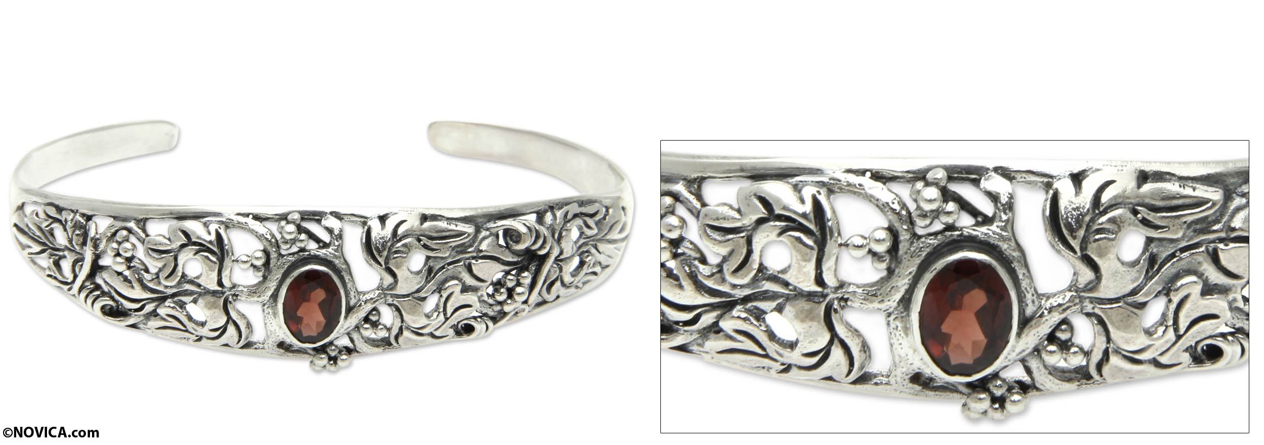Garnet sparkles with crimson fire in a bracelet by Nyoman Rena. Set amid sterling vines and silver berries, the 1.5-carat gem is the centerpiece of the fabulous artisan-crafted cuff.