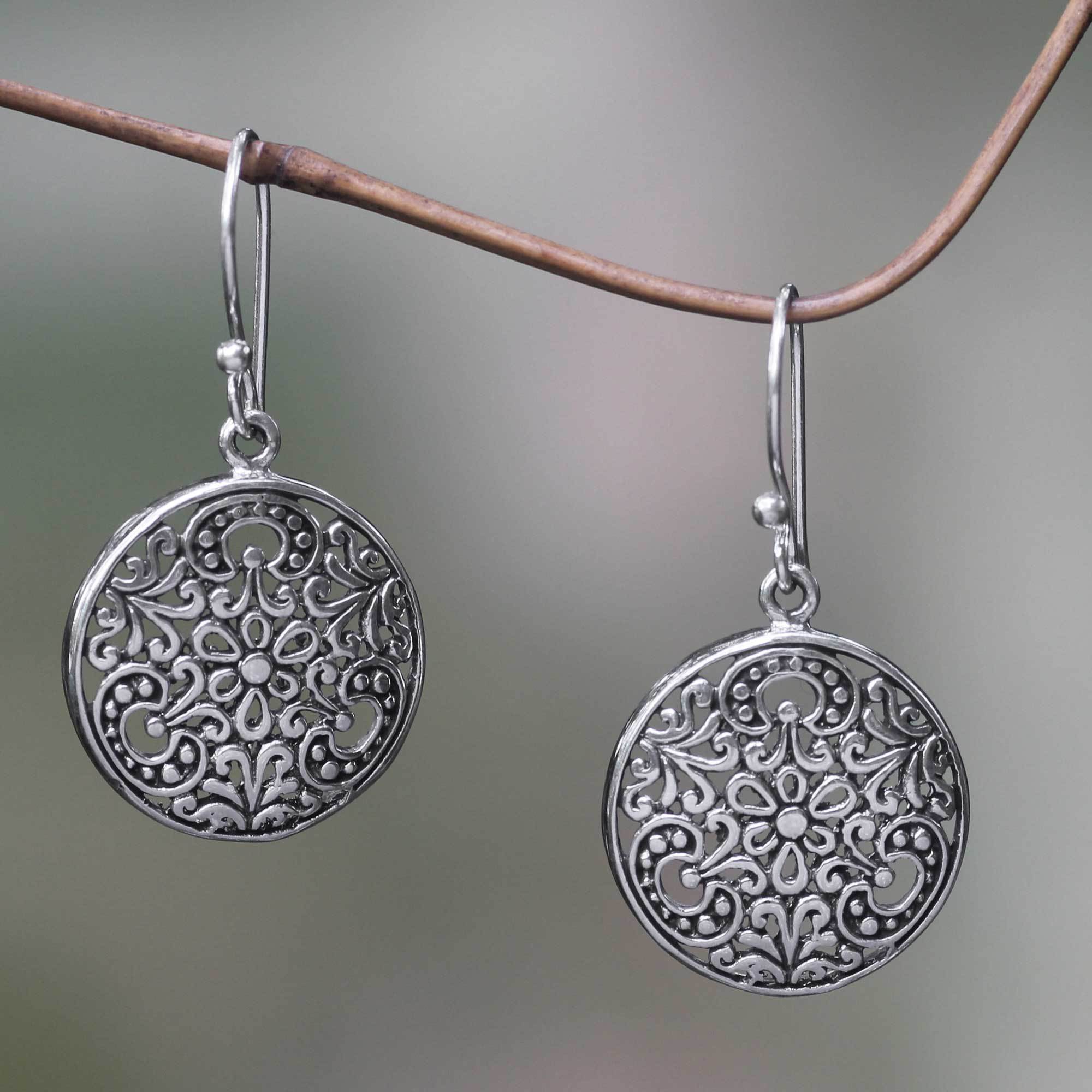 Swirling vines and blossoms cover radiant sterling disks. From Bali's Wayan Asmana, the original silver earrings evoke the tropical moon.