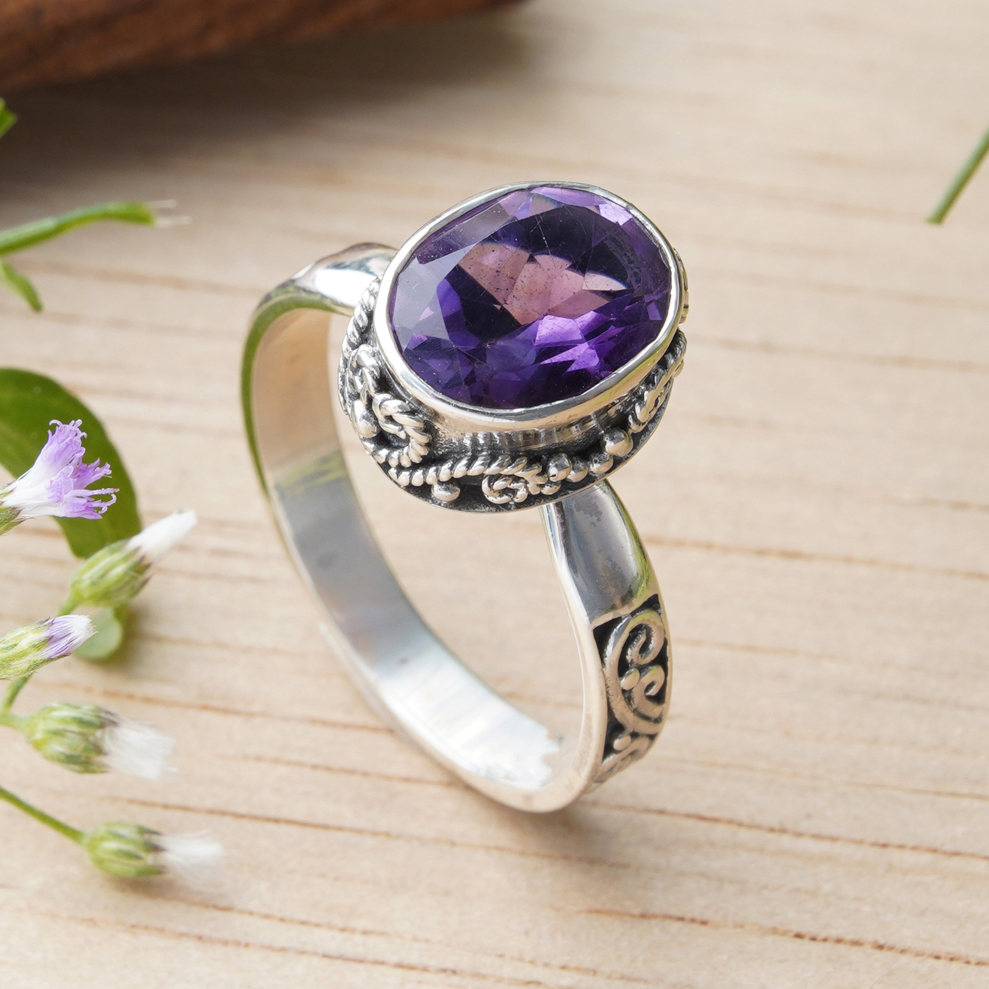 Balinese-Inspired 2-Carat Oval Amethyst Single Stone Ring, 'My Wise Journey'