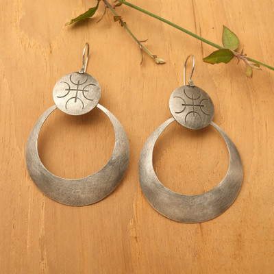 Bold and enigmatically stunning, these sterling silver dangle earrings by the Pertiwi Collection relive a Balinese tale of elegance. Sterling silver composes each of the pendants, decorated with mystic signs and a combination of oxidized and brushed satin finishes.