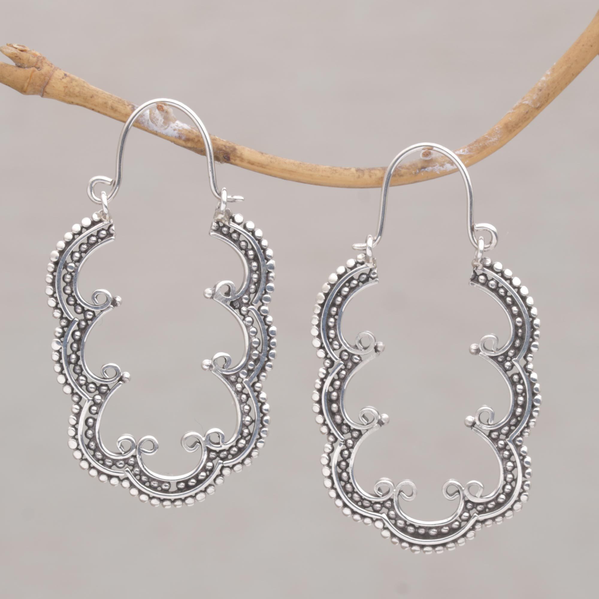 The curving, lobed leaves of the breadfruit tree serve as inspiration for the design of these uncommon and alluring hoop earrings from Balinese artisan Made Darmada. A member of the fig family, breadfruit is one of many delightful tropical fruits found on the Indonesian isle, and the dark green foliage of the trees on which it grows often forms shady canopies. Looping lines and dots in sterling silver with a combination finish are used to recreate the leaf design. The earrings close with saddleback clasps.