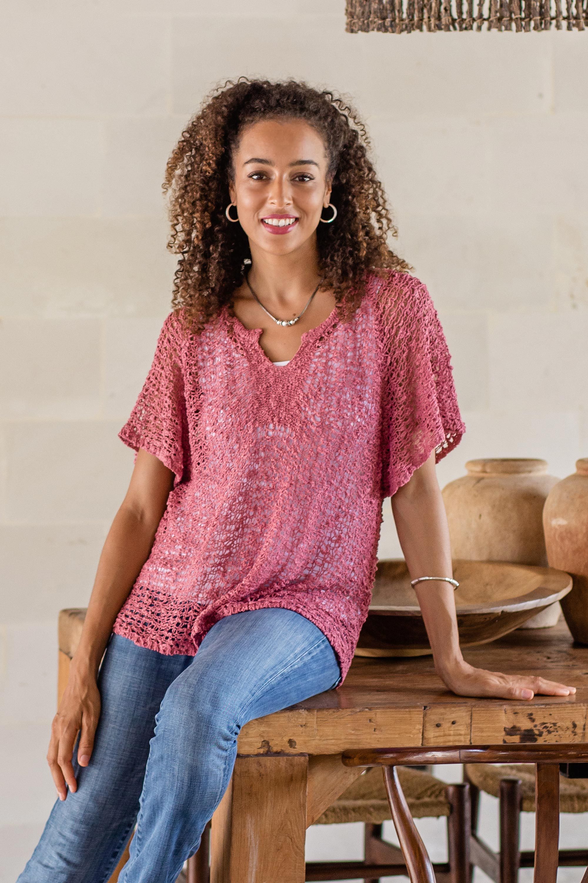 Get lost in a beautiful dream with this fanciful top in deep pink from Bali's Kadek Sari. Knit from a breezy acrylic blend, this lightweight openwork top is perfect for throwing on over a light cami on a hot day.