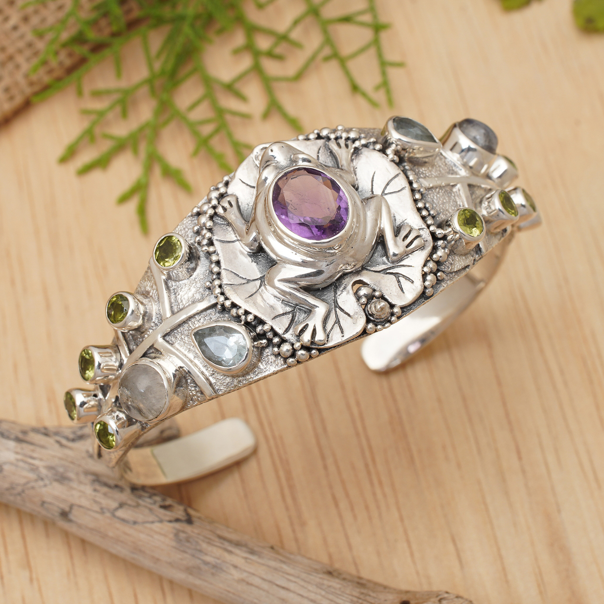 Like a hidden treasure inside a magic forest, this bracelet is sure to enchant. By Buana from Indonesia, .925 sterling silver is transformed into a captivating cuff. Featuring a 3-carat amethyst, accompanied by rainbow moonstone and peridot gems, this bracelet is a memorable delight.