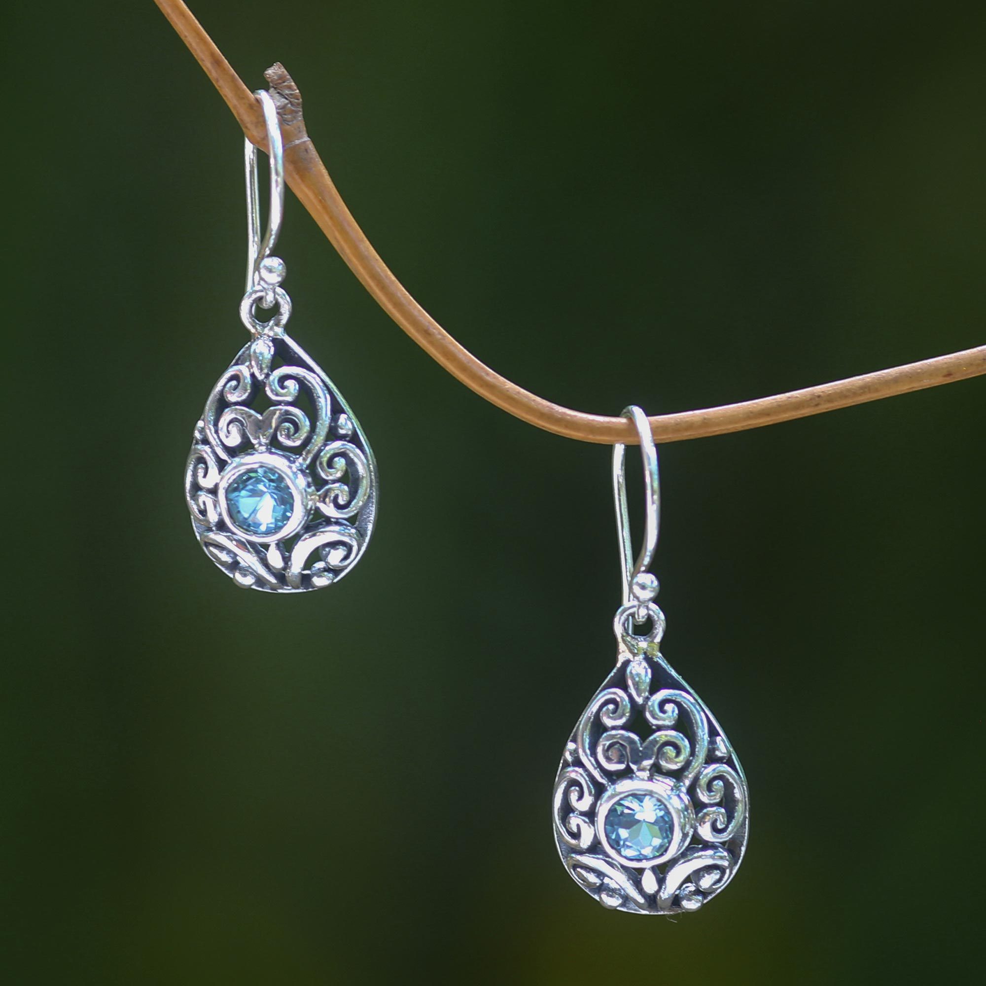 Balinese Ornate Silver Handcrafted Blue Topaz Earrings, 'Balinese Scarab'