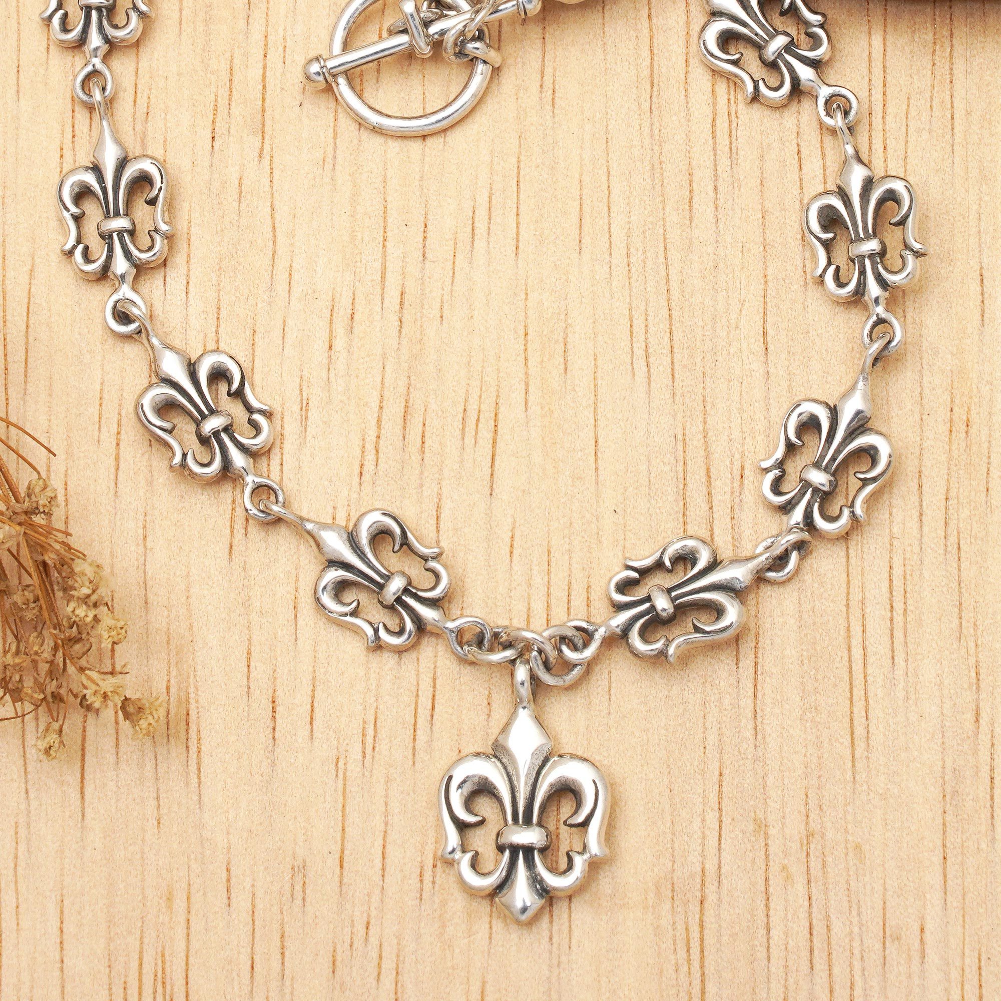 Stylized fleur de lis in polished sterling silver are joined together in this standout necklace from Balinese artisan Kadek Hendra. The necklace features a larger fleur de lis pendant at the center and a toggle clasp.