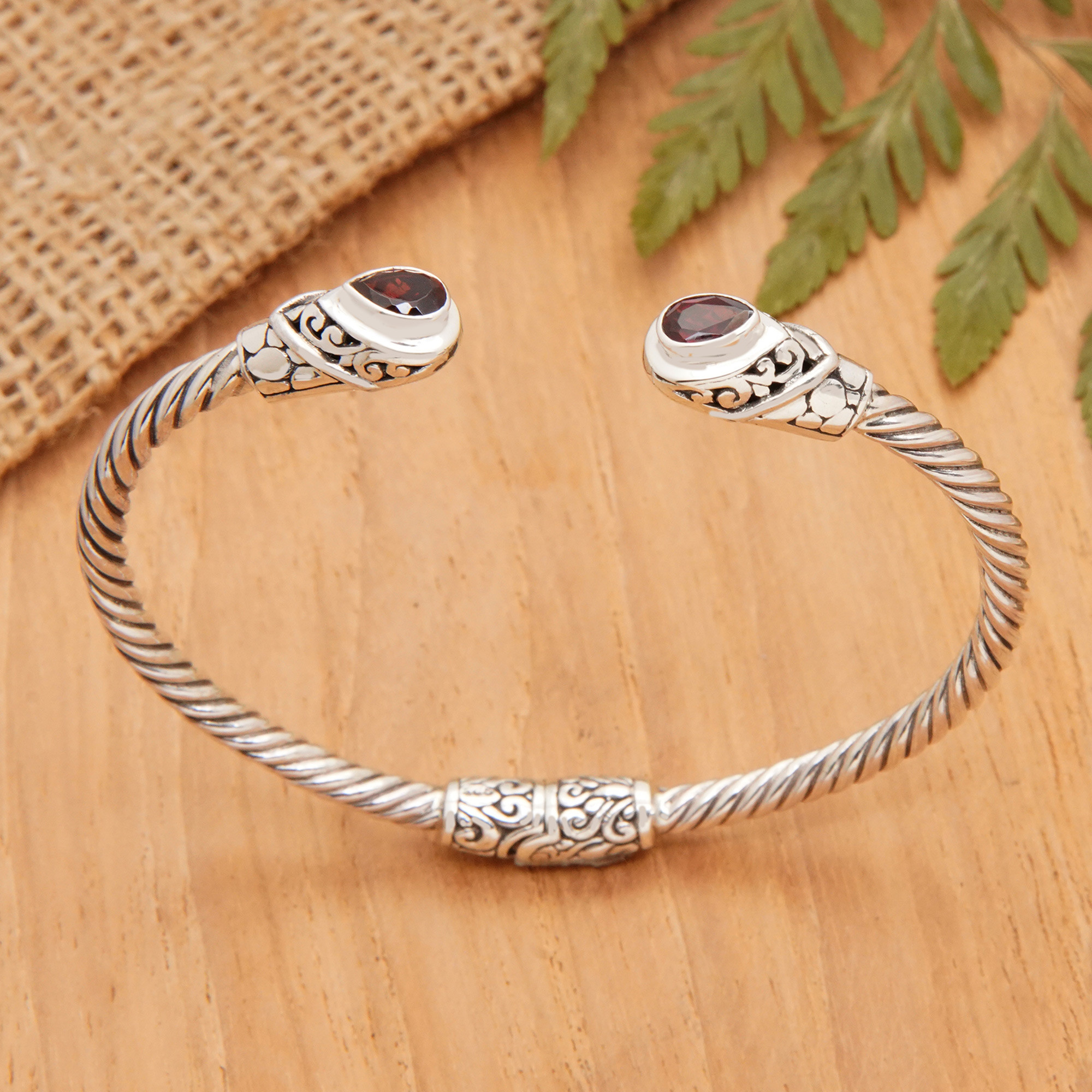 Natural garnet gems crown a traditional Balinese accessory featuring regional motifs for a glorious look. Giri Tasmana's sterling silver cuff bracelet comes in a polished finish with spiral formations that add a unique look to the design. On top of that, the crimson jewels symbolize perseverance, making it an exquisite piece perfect for any occasion.
