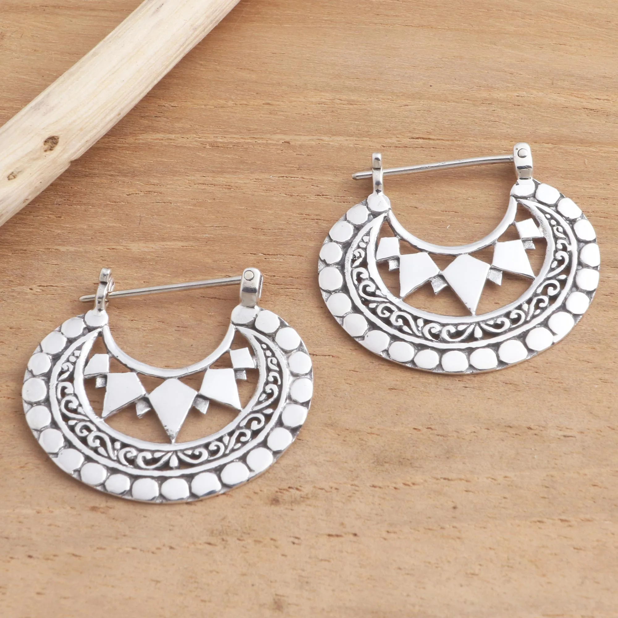 Balinese artisan Nyoman Rena works with his family and a small group of assistants to produce these glorious hoop earrings. Crafted from sterling silver, the earrings feature delicate swirls and geometric shapes, with a combination of high-polish and oxidized finishes to accentuate the fine details.