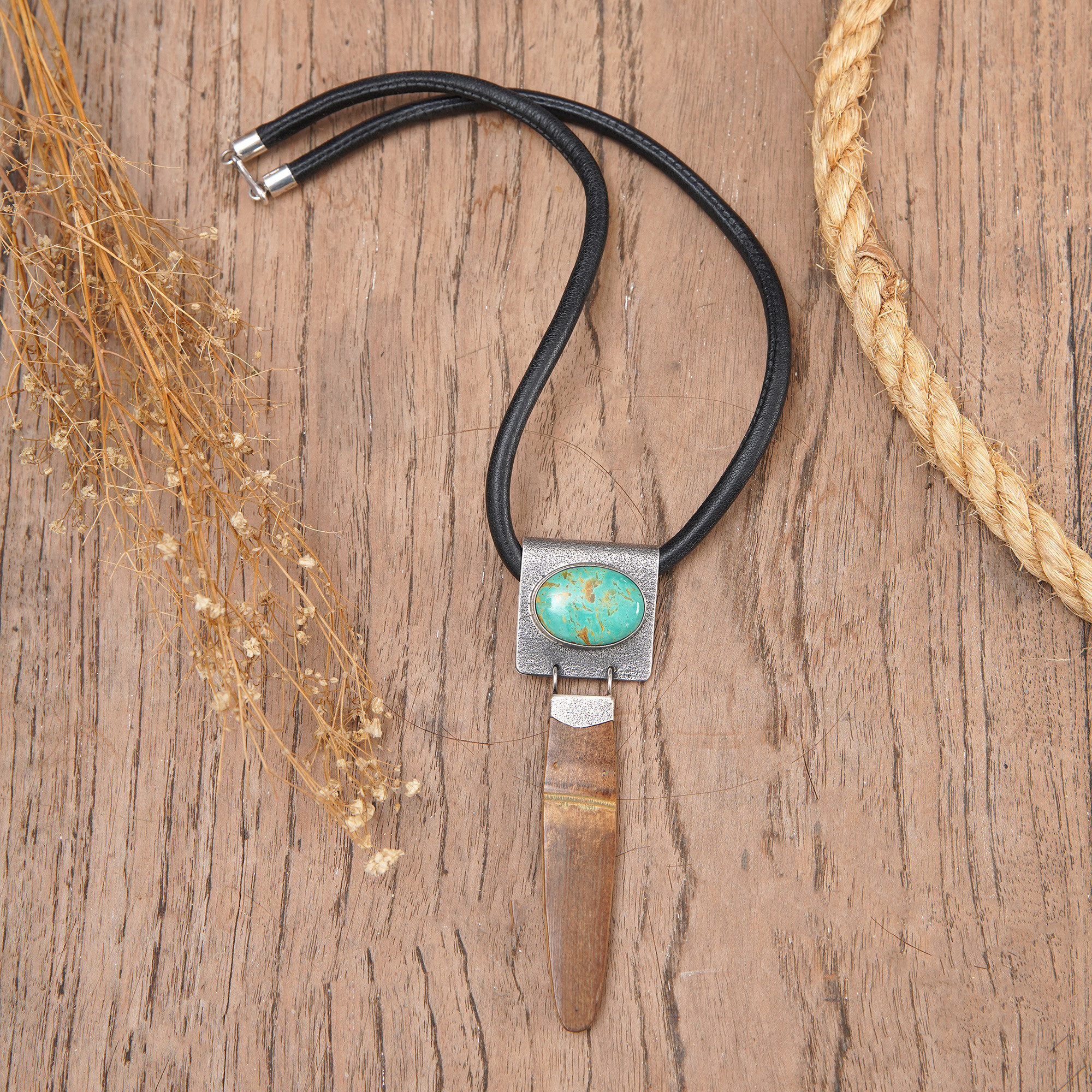 This unusual necklace brings together contrasting textures and materials. Natural turquoise and bamboo create modern imagery. By Warren and Robbin from Indonesia, each piece is individually handcrafted, with slight variations which grant each a distinct personality. The addition of .925 sterling silver and black leather cord elevate this necklace and make it a memorable accessory.