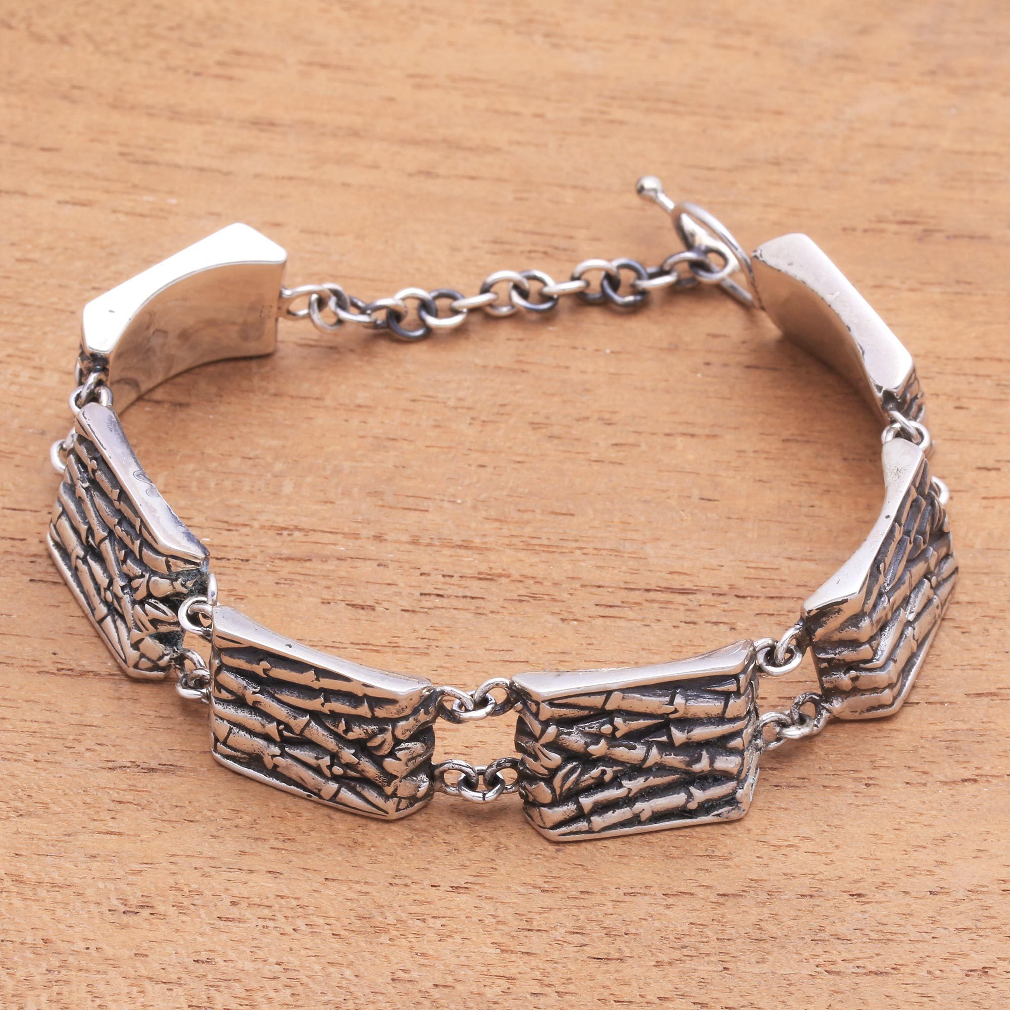 Realized in sterling silver with a combination of finishes, bamboo thickets decorate the rectangular links of this bracelet from Bali. Rosalia Tarigan designs this bracelet, crafted by local artisans.