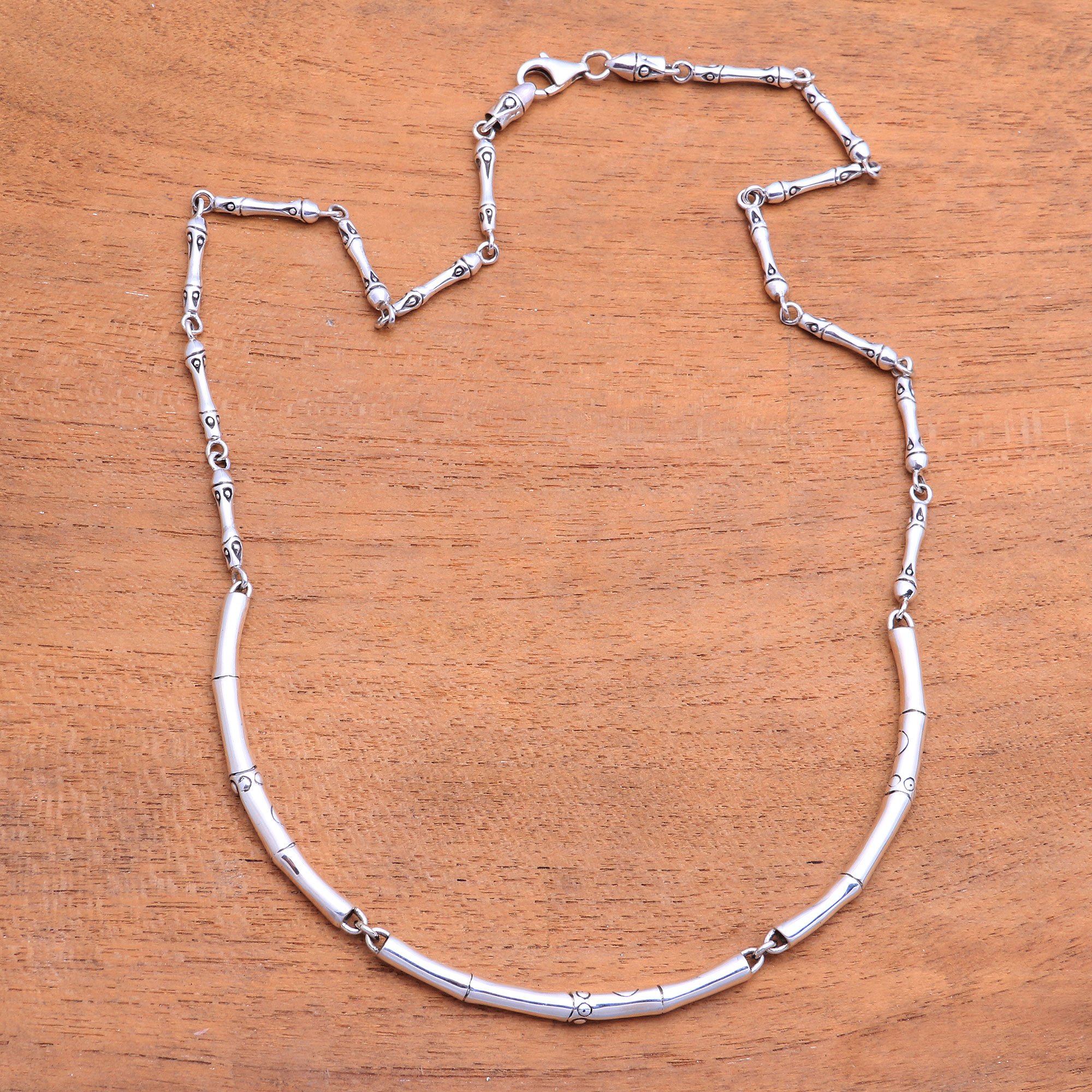 This necklace features a strand of bamboo-shaped links that circle the neck. Handcrafted from sterling silver by Indonesian artisan Nyoman Ariawan, this necklace brings a touch of the tropics to today's fashions.