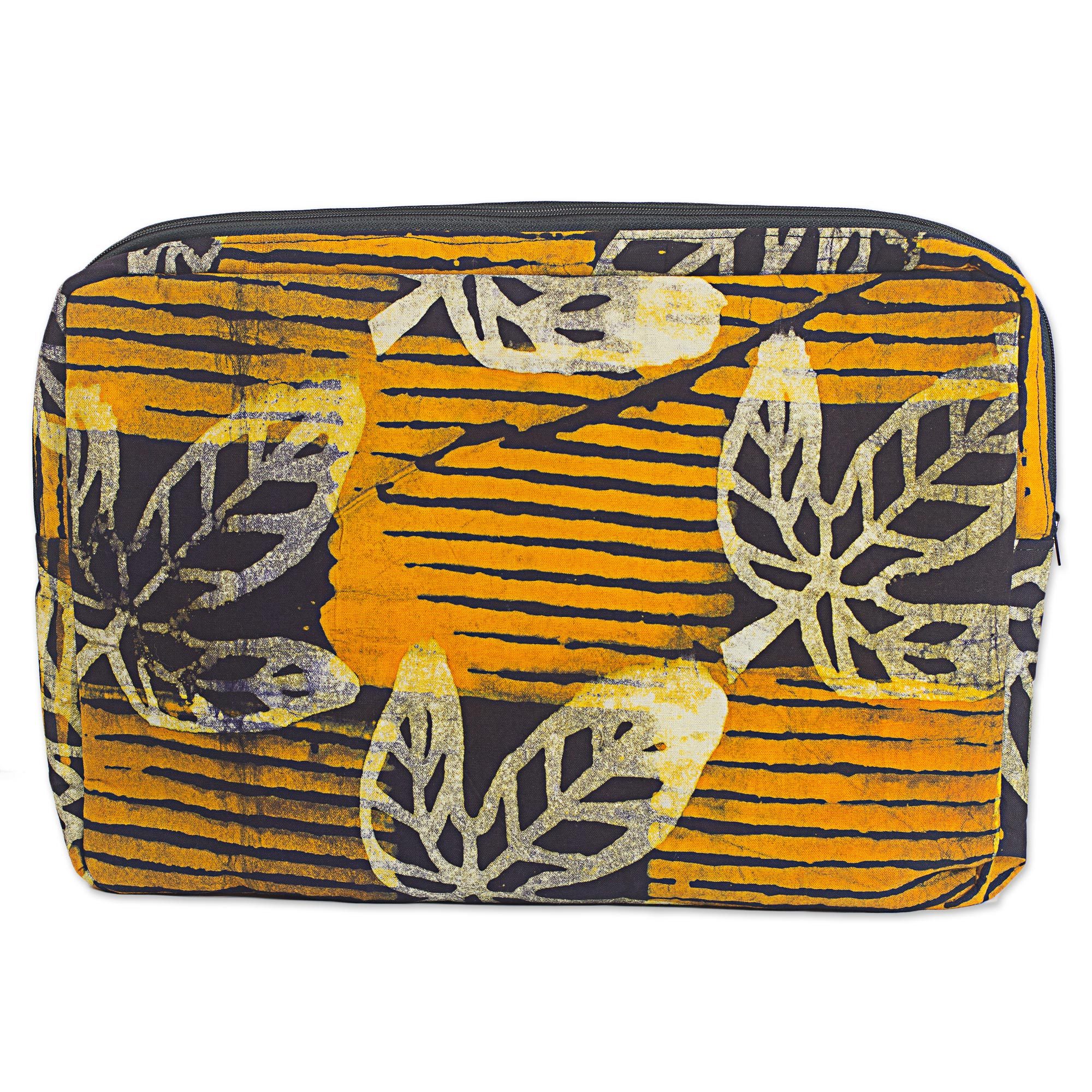 Batik Cotton14 Inch Tablet Sleeve in Saffron from Ghana, 'Leafy Protector'