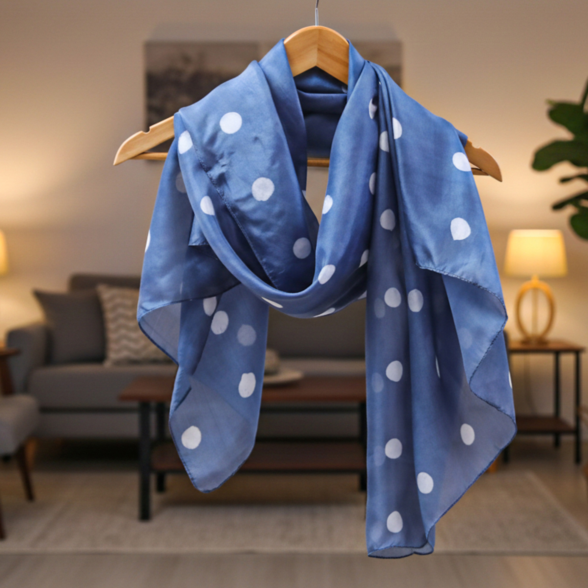 This crinkled scarf of vibrant elegance is by Thailand's Vinita. Loomed of a soft rayon and silk blend, the scarf is batik dyed with white polka dots over daring blue.