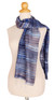 Thai designer Vinita creates a beautiful spectrum of colors that includes dark gray and navy blue on light blue for the design of this scarf. The scarf is woven on a traditional loom with raw silk, dyed and hand-painted with batik techniques, therefore intensity of colors and their placement might vary slightly.