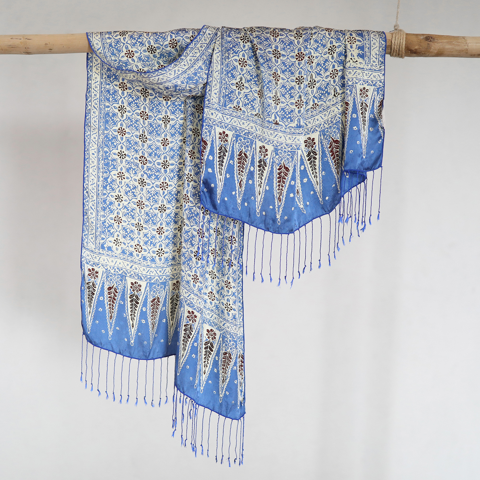 A world of traditional Javanese truntum motifs decorates this silk scarf. Yuni Kristina uses the batik method and dyes it in chartreuse and denim blue, drawing the designs with a wax resist before applying the colors. This feminine accessory makes a trendy companion for all occasions.
