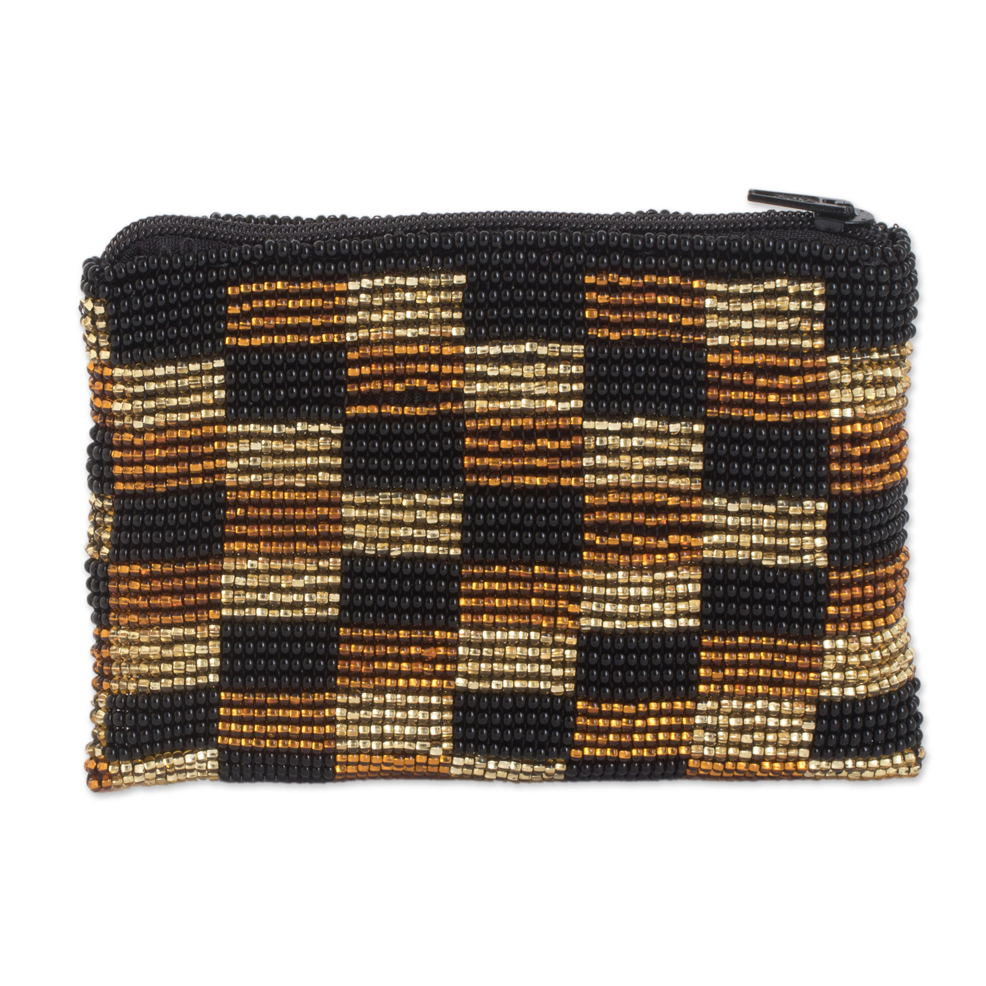 Embellished with delicate glass beads in a sophisticated palette of black, gold and brown, this lovely coin purse boasts a stunning checkered pattern that captures attention. This accessory comes with a zipper closure and offers a chic and practical storage solution for bills, change, credit cards and other small items. The fabulous purse is meticulously handcrafted by the skilled artisans of the Santiago Atitlan Women's Group in Guatemala.