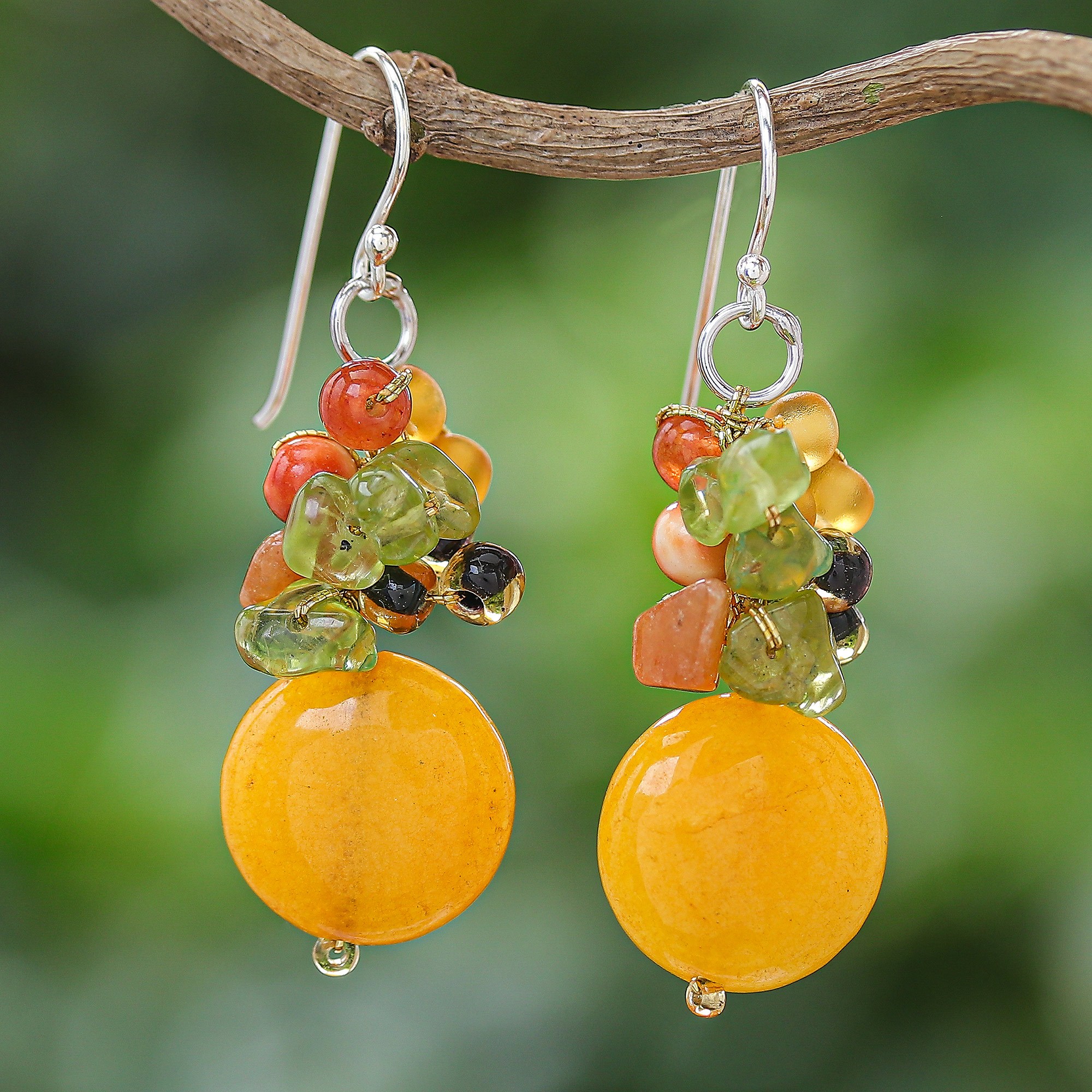 Nareerat in Thailand presents this sunny pair of beaded dangle earrings. Swinging from sterling silver hooks, the earrings feature yellow quartz discs topped by clusters of chalcedony, peridot, aventurine and glass beads.