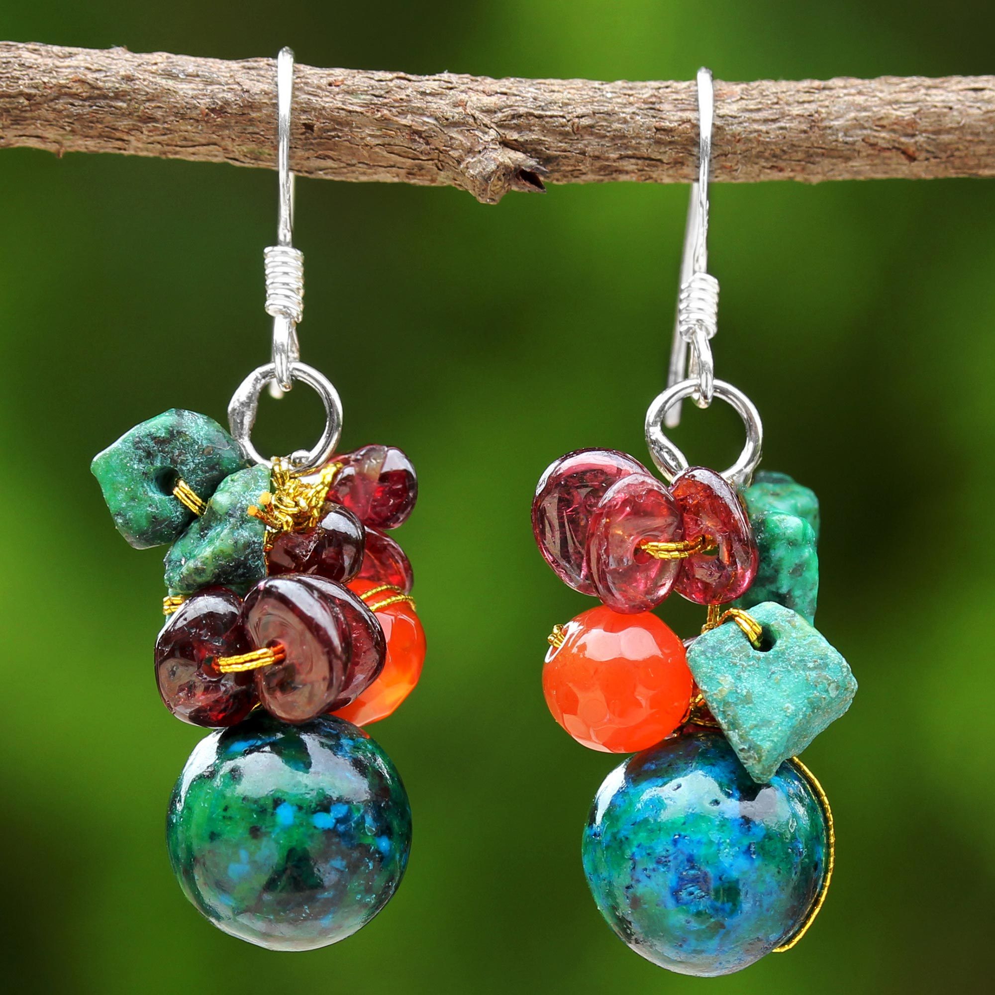 Conjuring a tropical oasis, Nareerat selects bright, cheerful colors for these pretty earrings. She crafts them by hand, threading garnet, carnelian, and globes of blue-green synthetic stones on golden silk threads. The colorful clusters hang from sterling silver hooks.