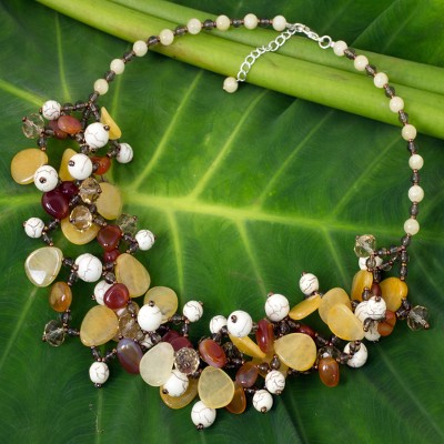 A rich variety of autumn-hued gemstones becomes a harmonious necklace in this original design from Thailand's Nareerat. The ensemble consists of carnelian, smoky quartz, dyed yellow quartz, and white calcite; with glass beads added for extra sparkle. The necklace is secured with a sterling silver plated lobster claw clasp.
