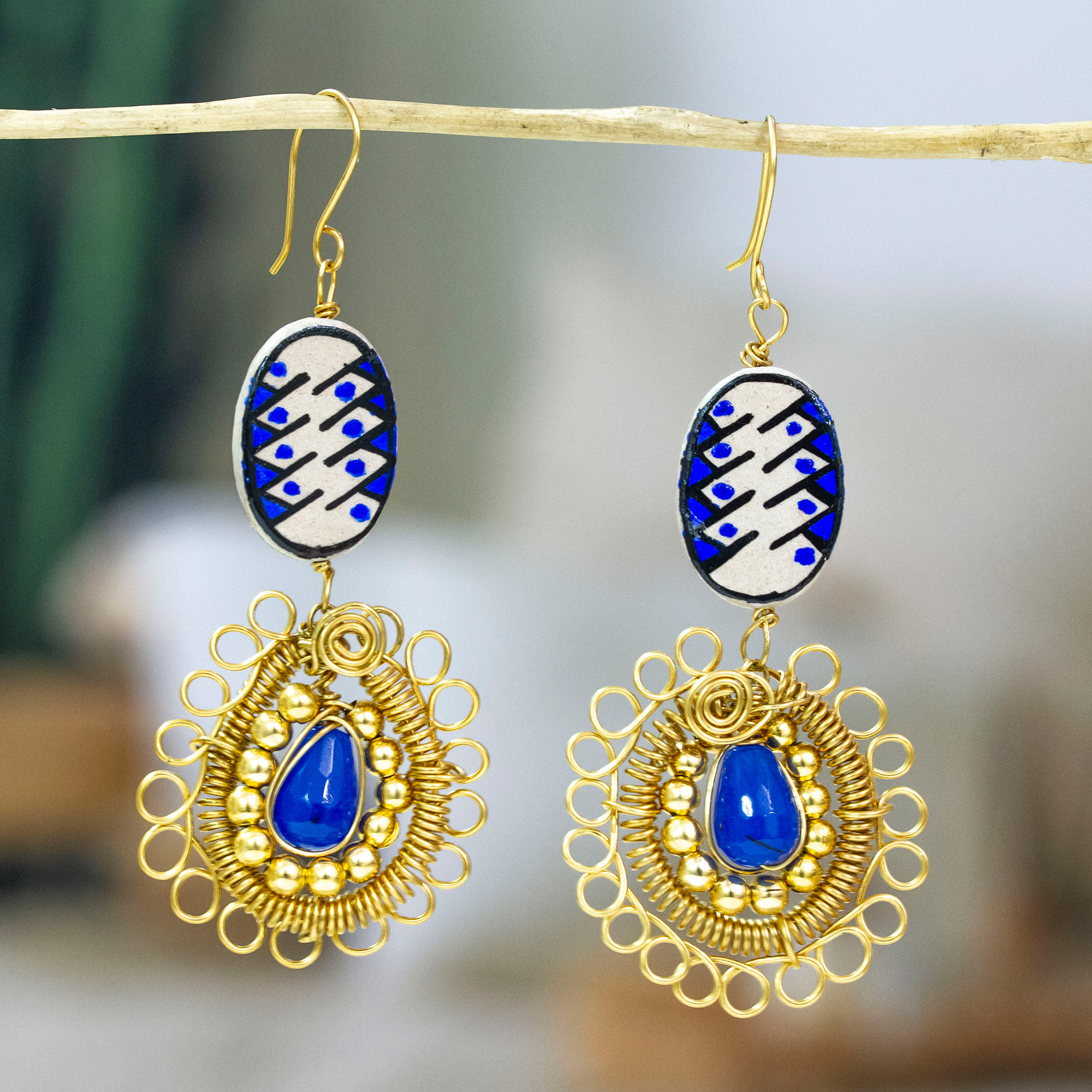 Creatively combining different materials, Mexican artisans Martha and Ambar Mireles craft these lovely dangle earrings. The 18k gold plated steel wire earrings feature handcrafted ovals of ceramic above glossy blue crystal beads.