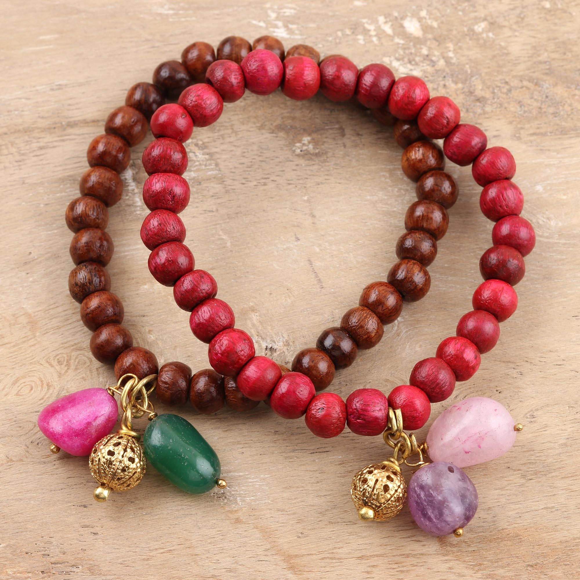 Beaded Wood Bracelets with Quartz and Brass (Pair), 'Delhi Kinship'