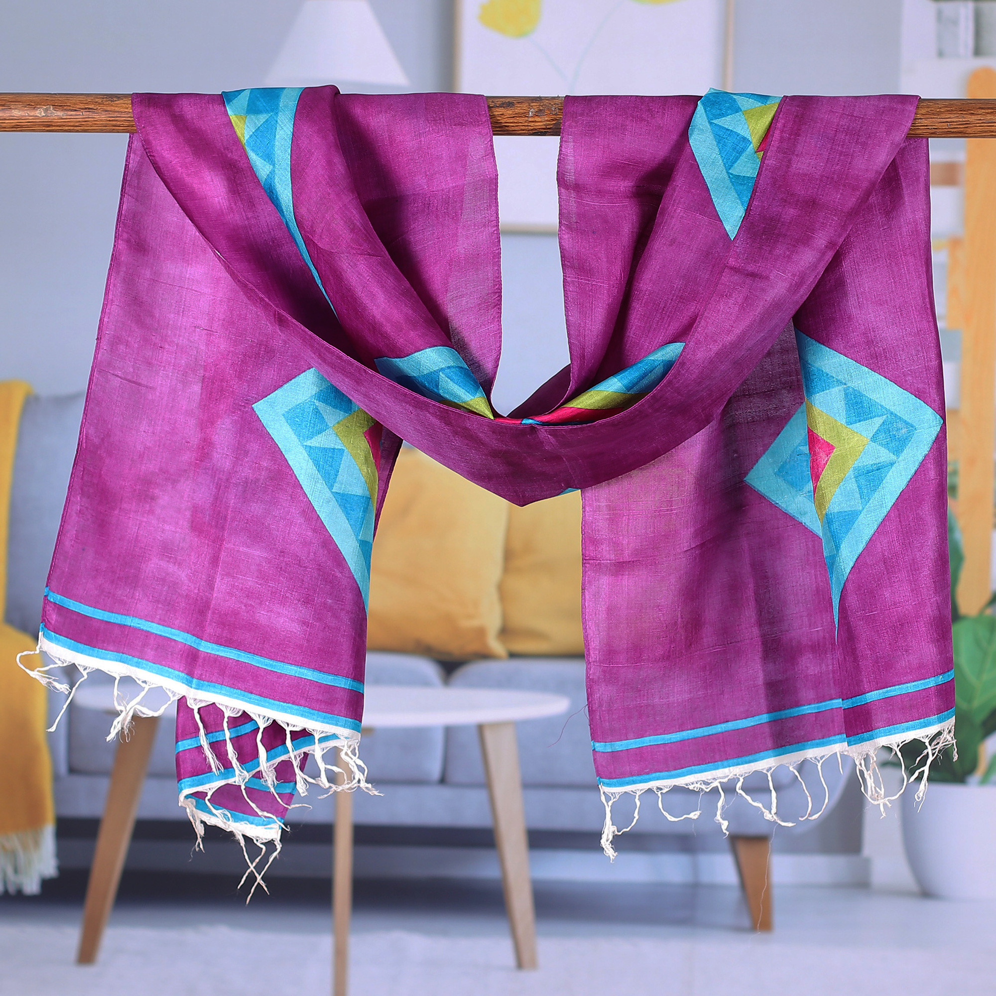 Bengal Multi-Colored Geometric Silk Shawl with Fringe, 'Festival of Bengal'