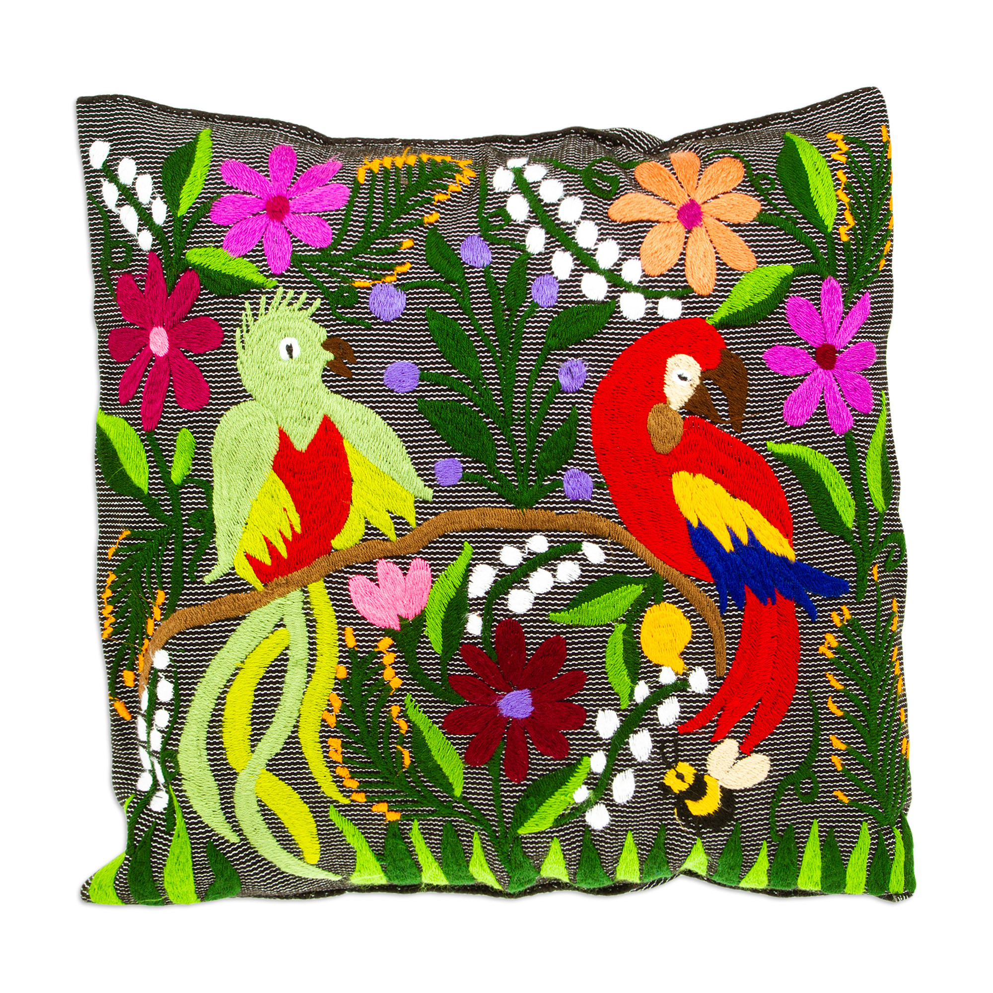 A quetzal and a parrot adorn this beautiful cushion cover from Lorenza Perez in Mexico. The artisan hand-embroiders the front of the colorful cover in a process that can take as long as four weeks. The plain back features a slit for inserting a cushion.