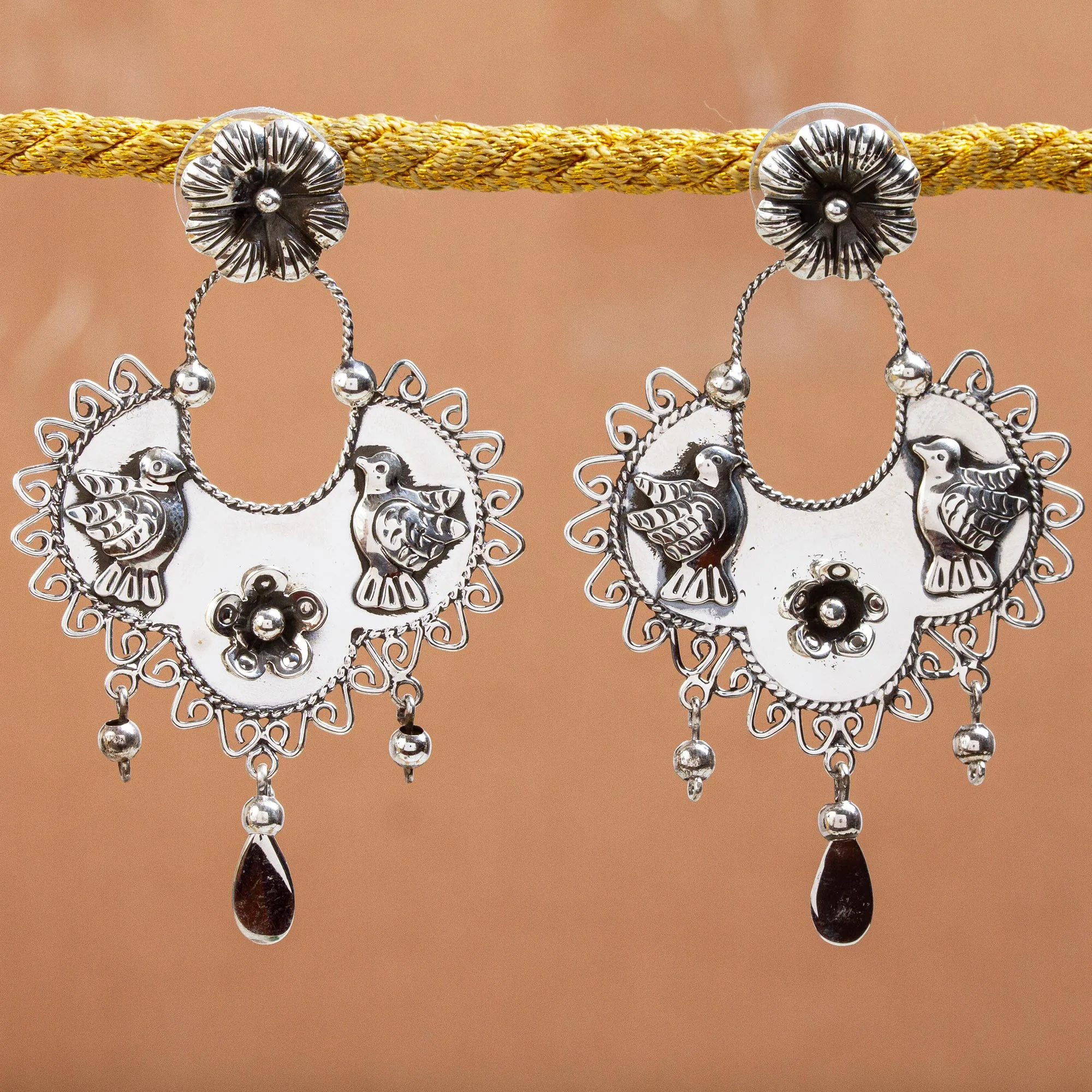 Bird Pattern Taxco Sterling Silver Dangle Earrings, 'Eden Birds'