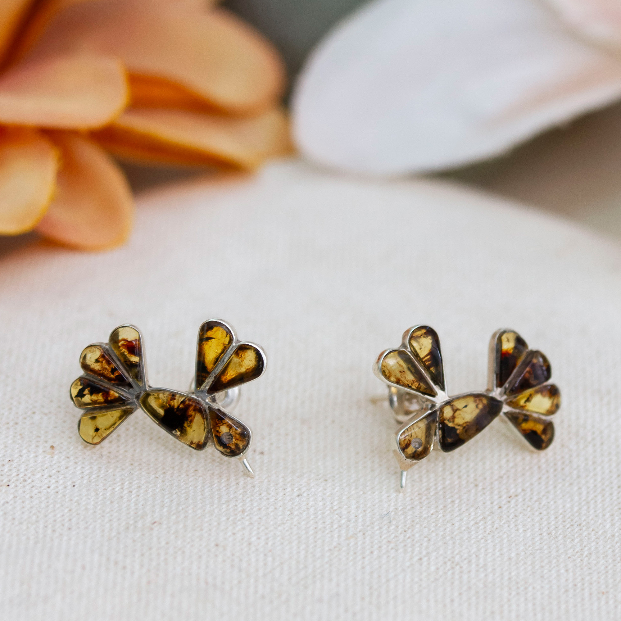Fascinating in their beauty, two birds are made from cabochons of natural amber in this pair of Mexican button earrings. Jacqueline and Eddy create these earrings, crafted from sterling silver.