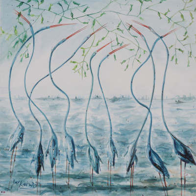 This watercolor painting on paper by Indian artist Jay Karun presents a serene, lyrical scene drawn from nature with a contemporary, expressive touch. A row of elegant long-necked birds, reminiscent of herons or cranes, stands in shallow, rippling water, their sinuous necks creating a graceful rhythm across the composition. Cool blues and aquas dominate the palette, enlivened by subtle red accents at the beaks, while delicate green branches arch above, softly framing the scene. Loose washes and fluid brushstrokes suggest atmosphere and gentle movement, evoking a sense of tranquility, balance and harmony between wildlife and its environment.