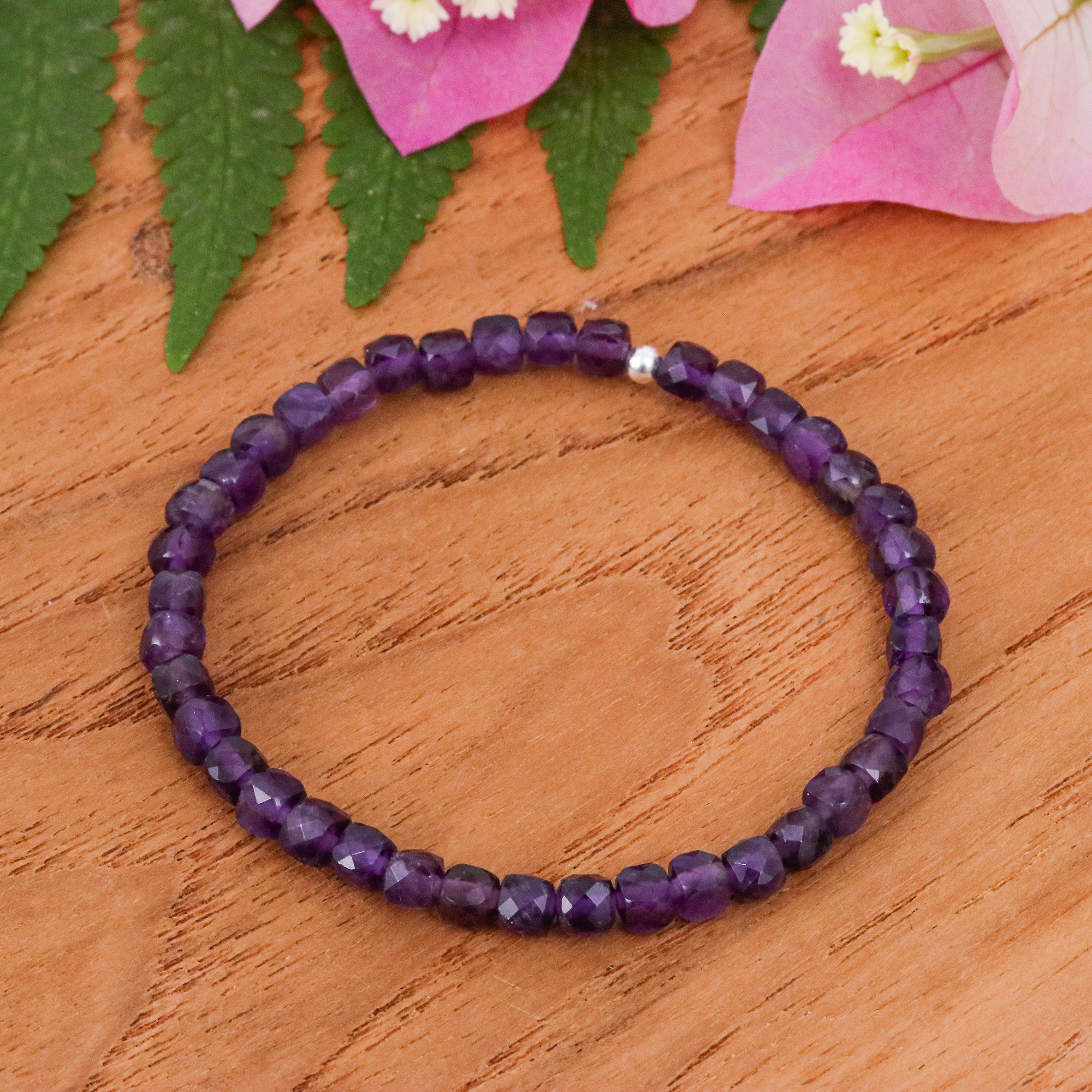 Sublime amethyst beads boast their enchantment in this bracelet, designed by Arshad Ullah of Thailand. Talented artisans work on this glamorous piece, whose elastic cord holds 15 carats of faceted jewels—each a symbol of wisdom. A sterling silver-plated bead crowns the center with a glowing touch.