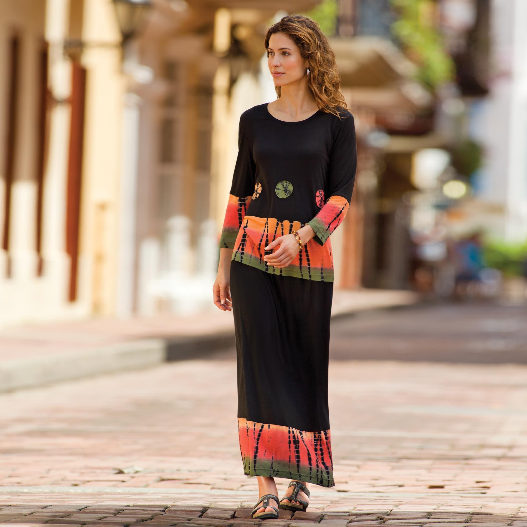 Bandhani is a tie-dyeing technique practiced mainly in western India. Intricate patterns are created by wrapping the fabric with string before dyeing it. When the fabric is untied, natural patterns appear in the places where the string prevented the dye from taking hold. Bandhani cloth is often used for women's shawls, but here the technique is adapted for a silky top. Made of a black viscose rayon knit, the top drapes beautifully and features three-quarter length sleeves.