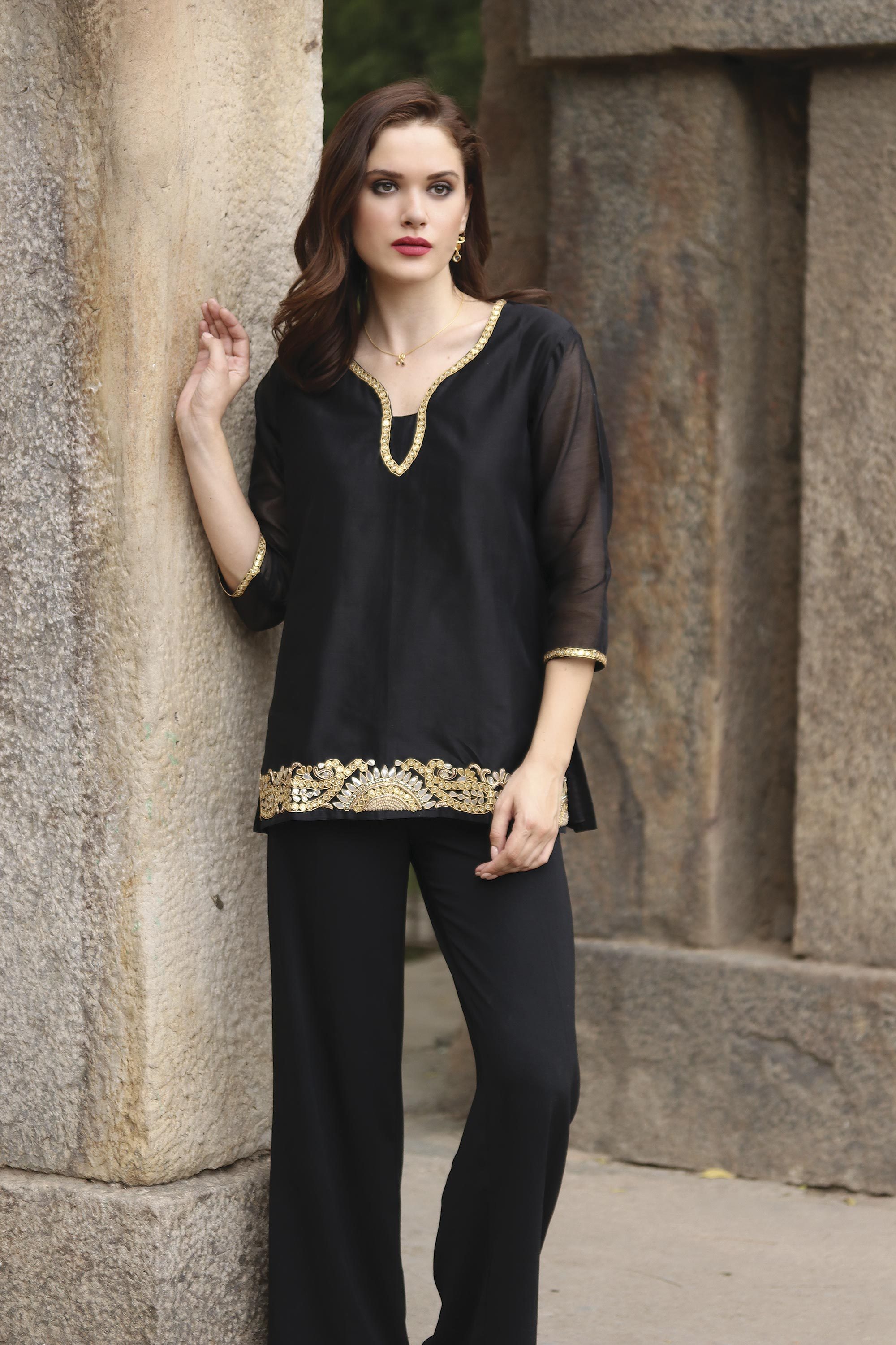 A shimmering black cotton and silk blend becomes a beautiful blouse by Isha Jain. Intricate gota embroidery combines with beads and sequins to surround the sleeves and neckline, while a wide band trims the front hem. Similar to appliqué, gota embroidery involves adding a different fabric to the background to create new textures.