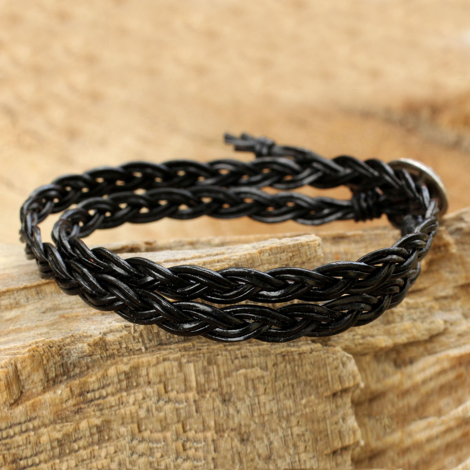 Braiding black leather by hand, Siriporn crafts a beautiful bracelet. It wraps around the wrist to close with a silver button from Thailand's hill tribe artisans.
