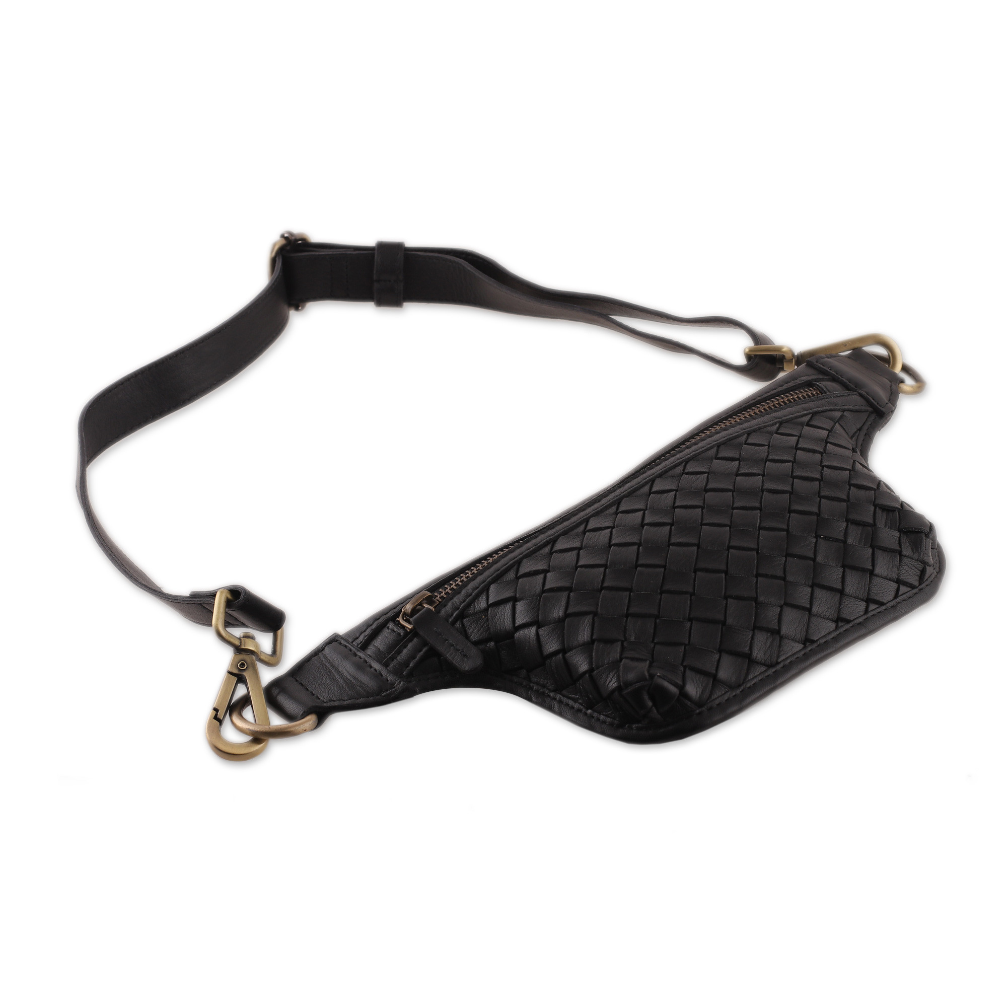 Black Criss Cross Leather Fanny Pack with Adjustable Strap, 'Trendy Versatility'