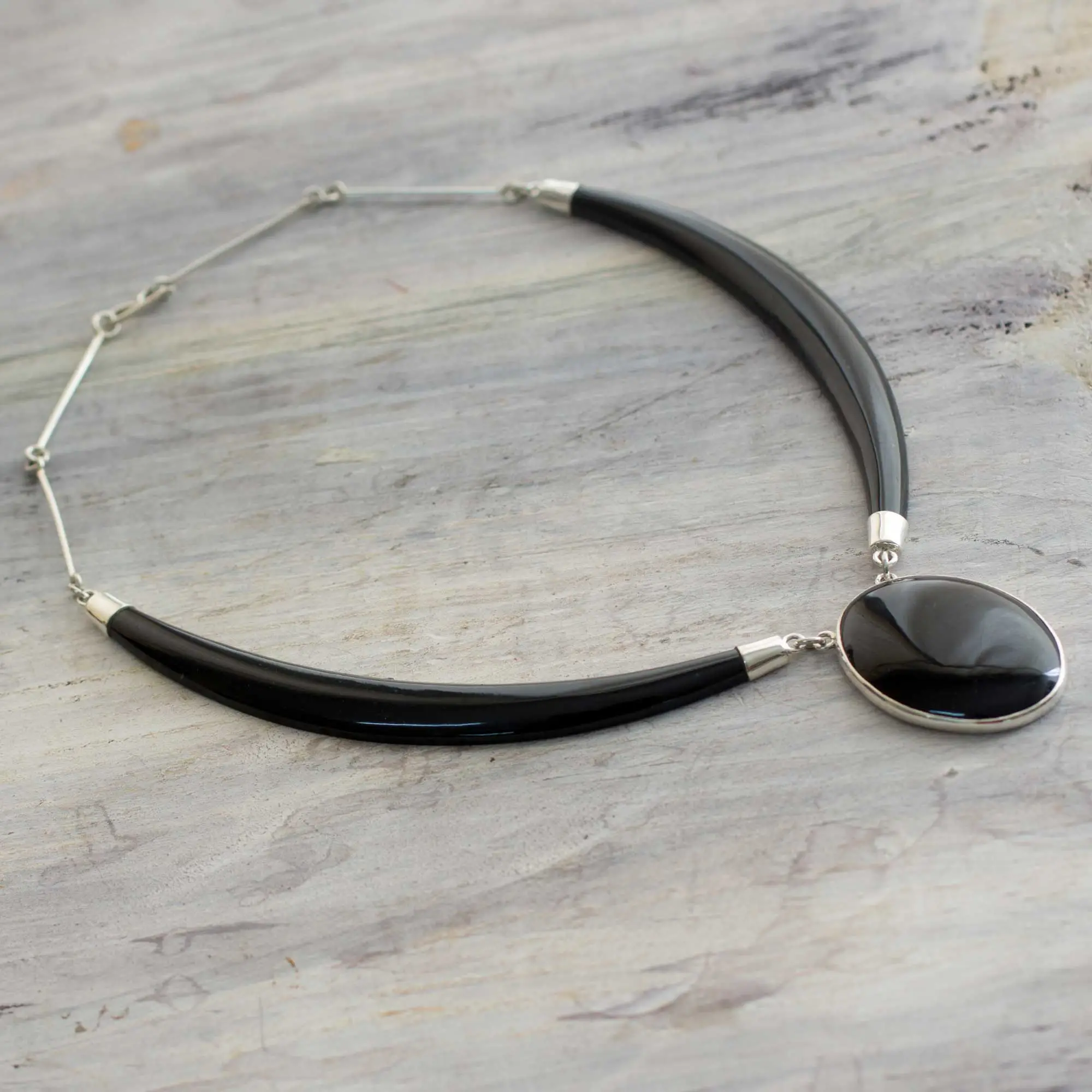 "The design of this necklace is very special to us, because we're carving large pieces of black jade and we're loving the final result," confide Ruben and Gilda Perez. They craft the necklace by hand with the luminous sheen of sterling silver for a stunning contrast.