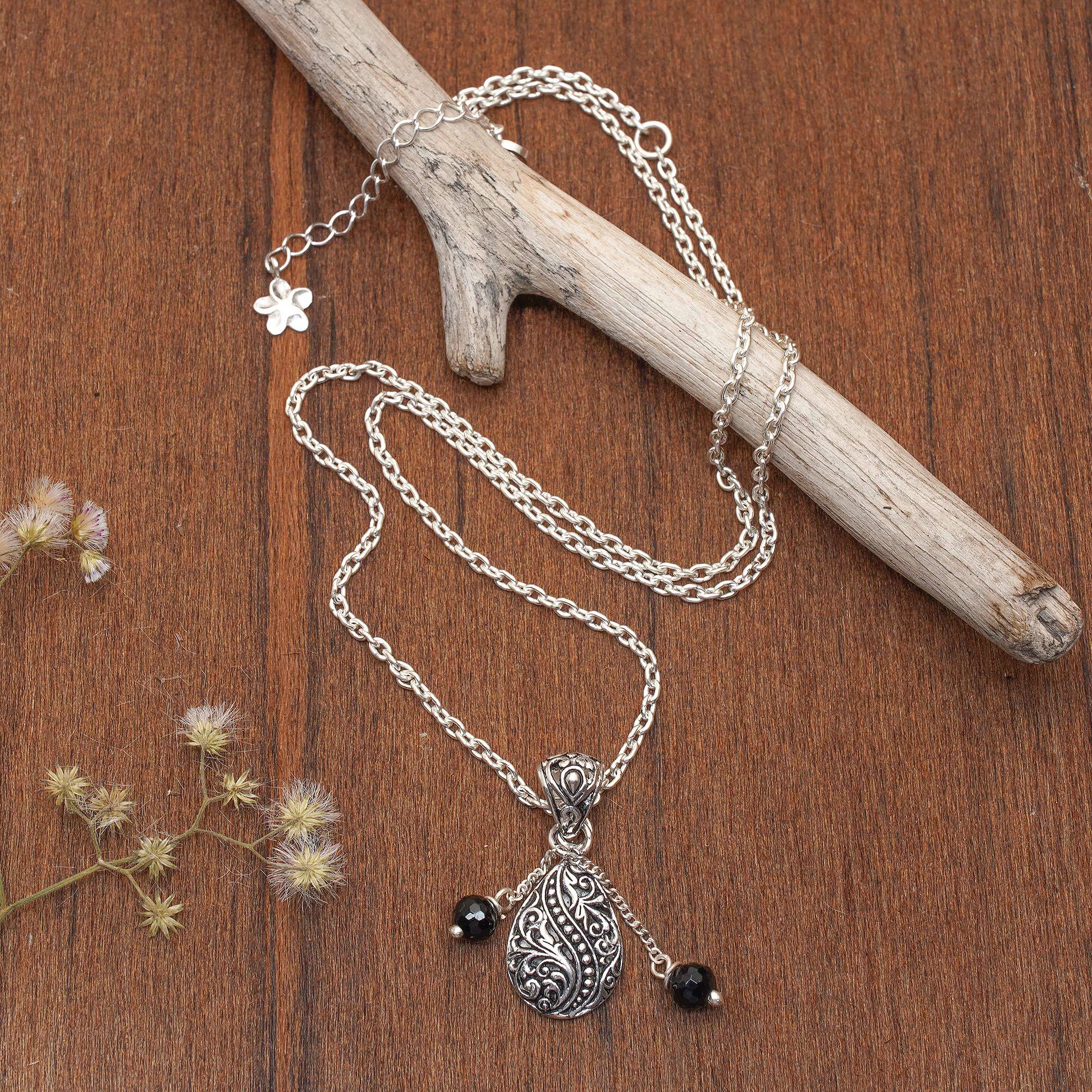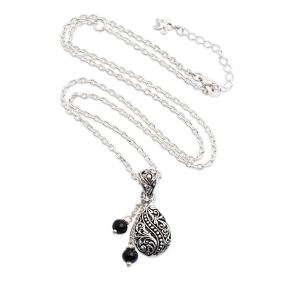 Polished black onyx beads dance gracefully in this sterling silver pendant necklace, showcasing bold Balinese motifs with a combination finish that plays between light and shadow. The balance of modern style and traditional designs gives artisan Ekayani's necklace its edge, making it a standout piece created for repeat wear.