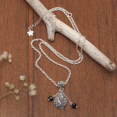 Black Onyx Sterling Silver Pendant Necklace from Bali, 'Garden Elegance'