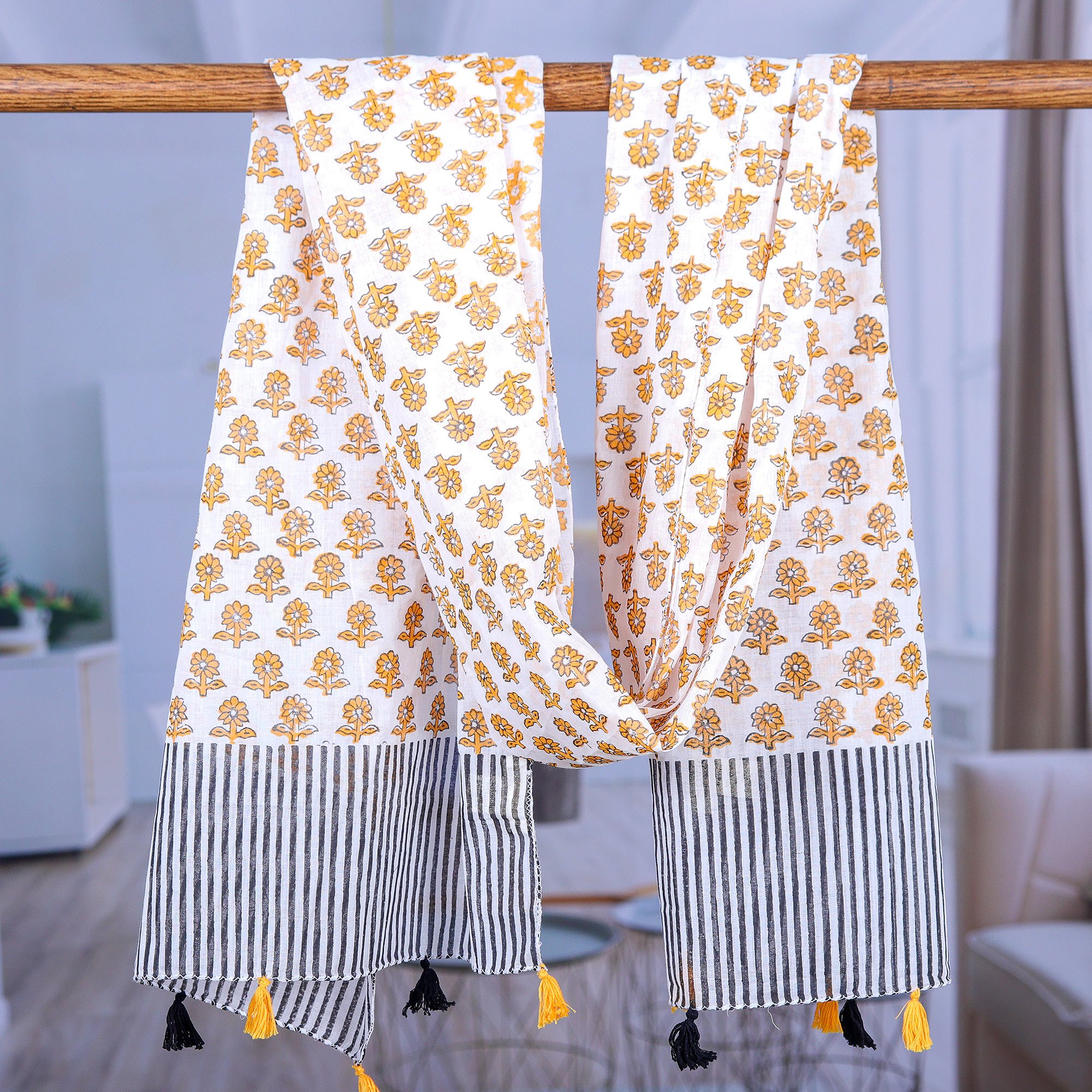 Adorn your sweet essence with an ethereal garden of goldenrod blooms and black stripes. Designed in India by Rajnandinee and Srabonti, this tassel-accented cotton scarf captures the region's natural aura in each of its floral motifs, all made with block-printing techniques that allow a unique look.