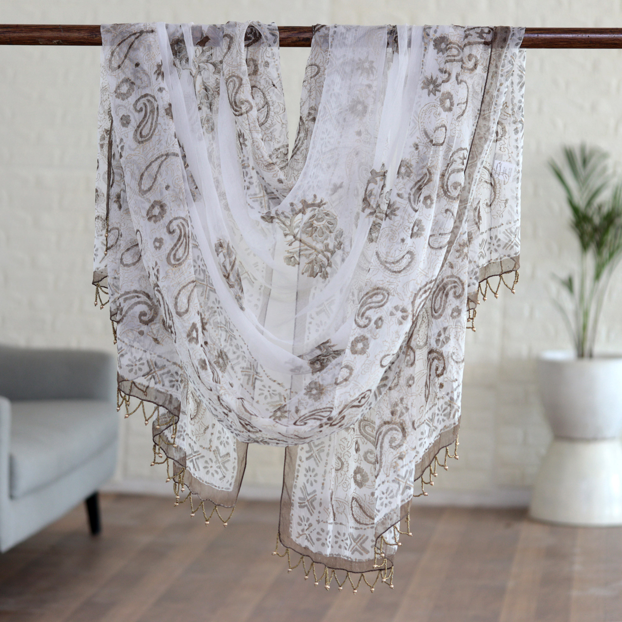 Shades of bronze and gold add a luxurious look to this gossamer chiffon shawl from the workshop of Vijay Singh. The Jaipur-based designer is known for his beautiful block prints on feminine fabrics with extra details like the tiny beaded fringe that adorns the ends of this exquisite shawl. Dress it up or down, the pretty print and tonal embellishments are sure to be eye-catching.