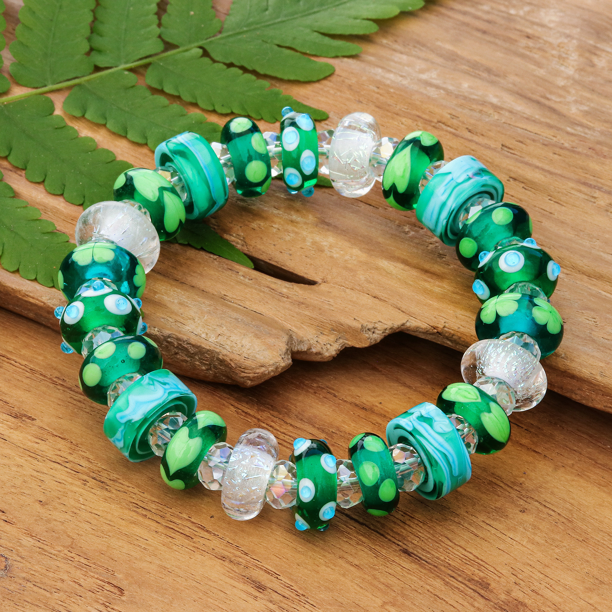 Slip on this gorgeous stretch bracelet and be mesmerized by the artistic patterns of its handblown glass beads. The delicate motifs and vivid green and blue shades give each bead a personality of its own. Crafted by Thai artisan Alexx Cheng and also featuring petite crystal beads, this bracelet offers a delightful way to bring artistry into your everyday style.