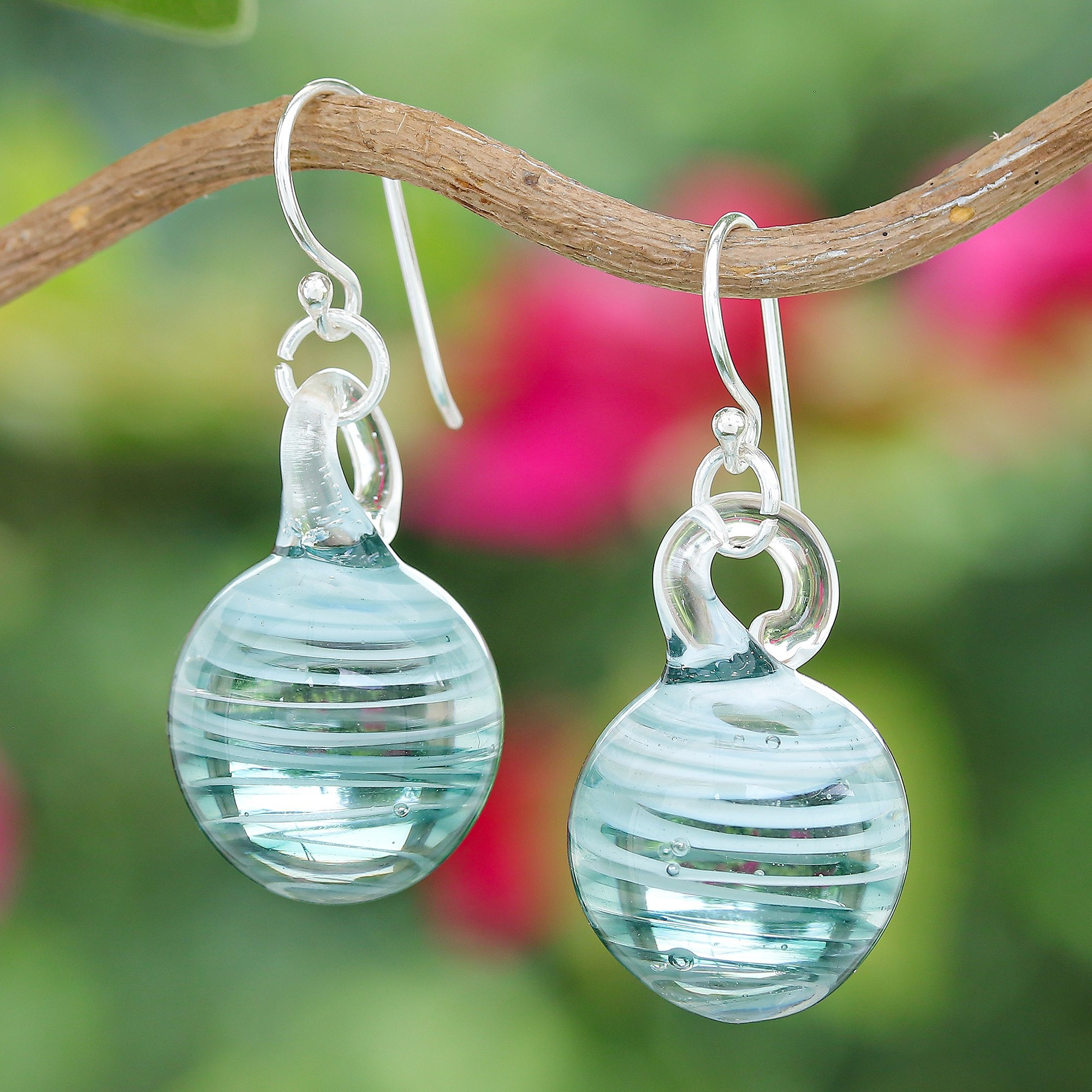 Blown Glass Dangle Earrings with Light Blue & White Spirals, 'Light Blue Ball'
