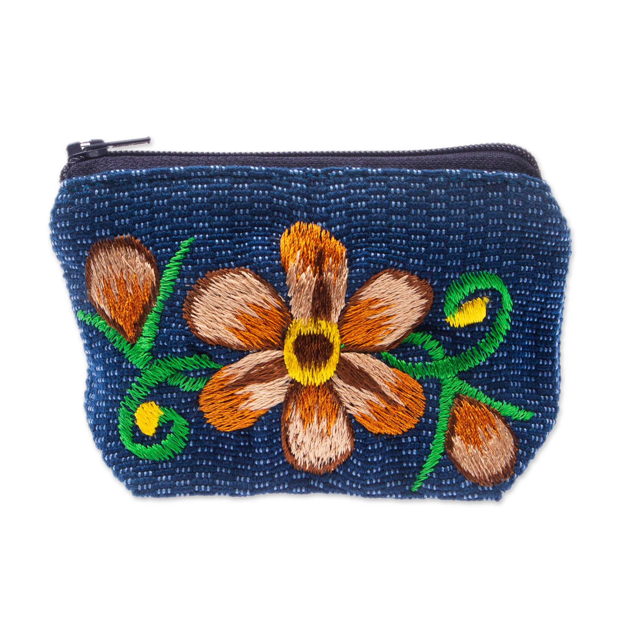 Blue and Ginger Floral Embroidered 100% Cotton Coin Purse, 'Bloom of Autumn'