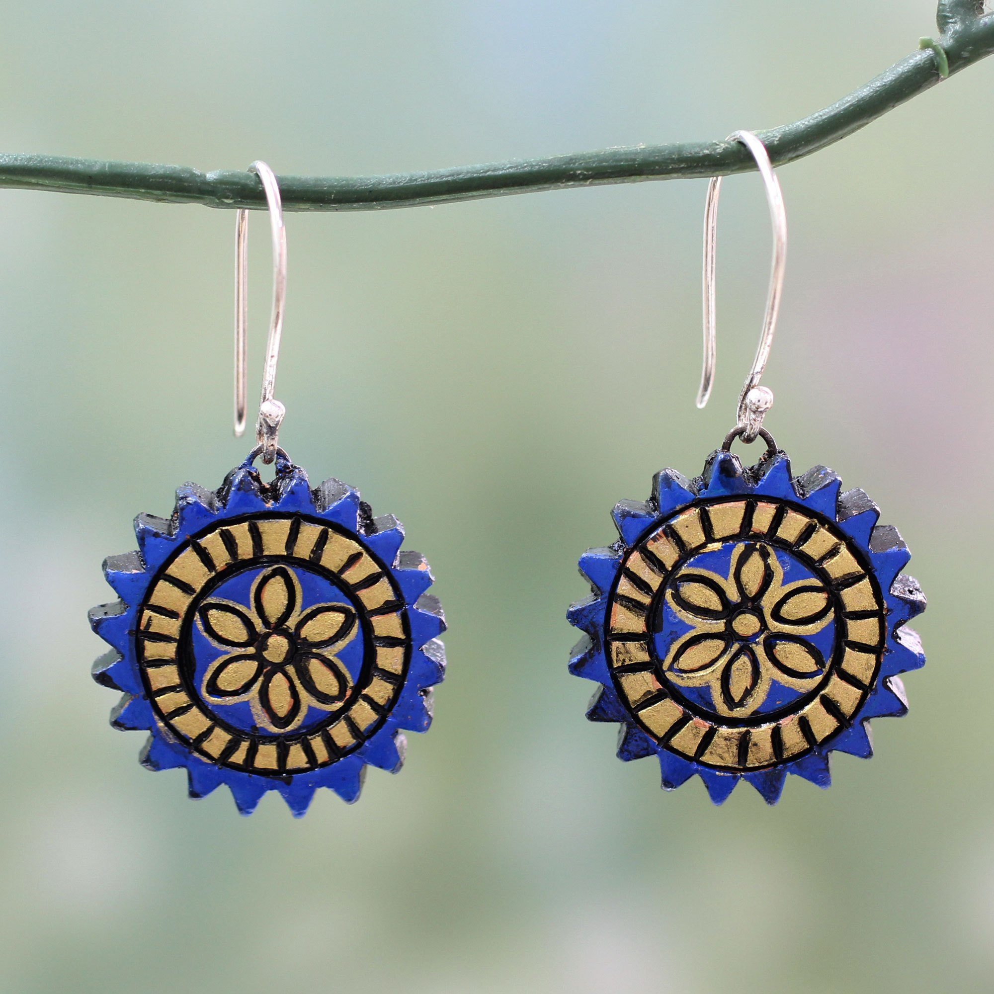Blue and Golden Hand Painted Terracotta Silver Hook Earrings, 'Peaceful Chakra'