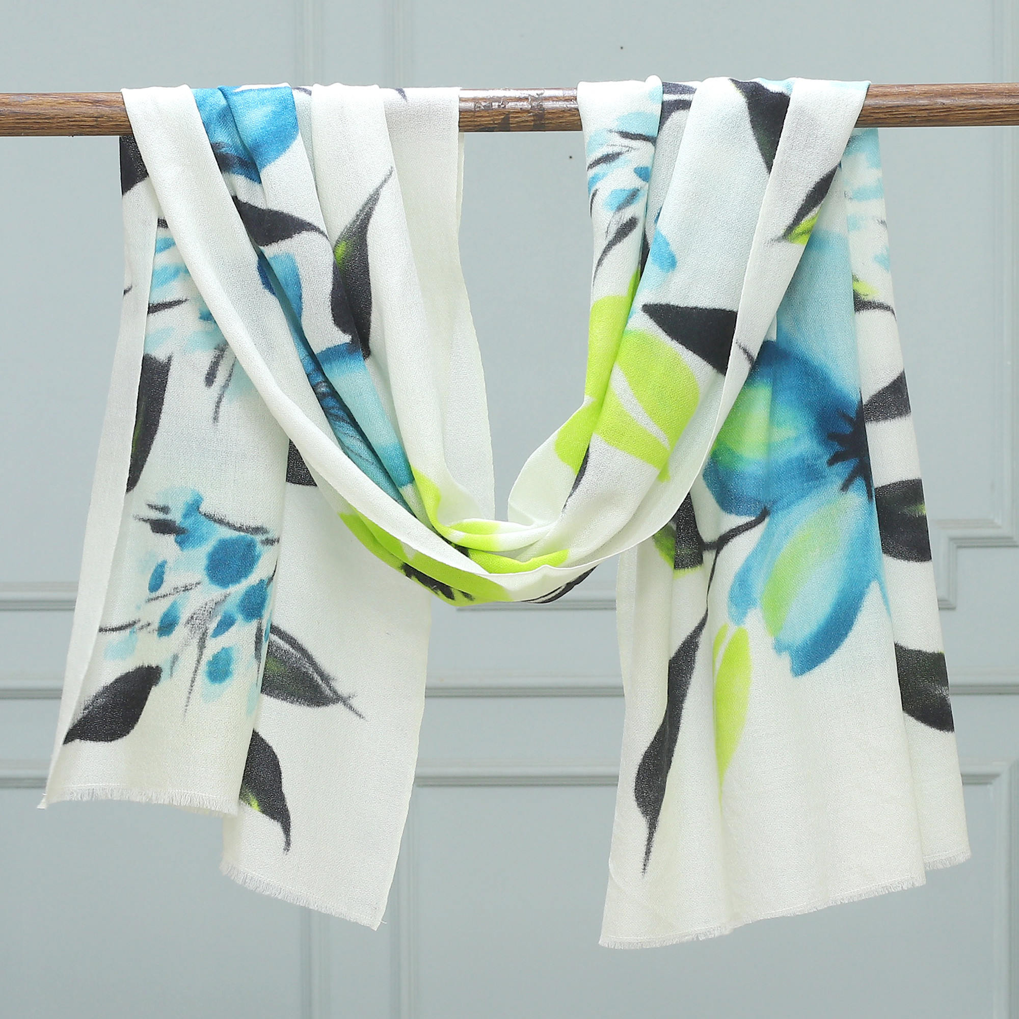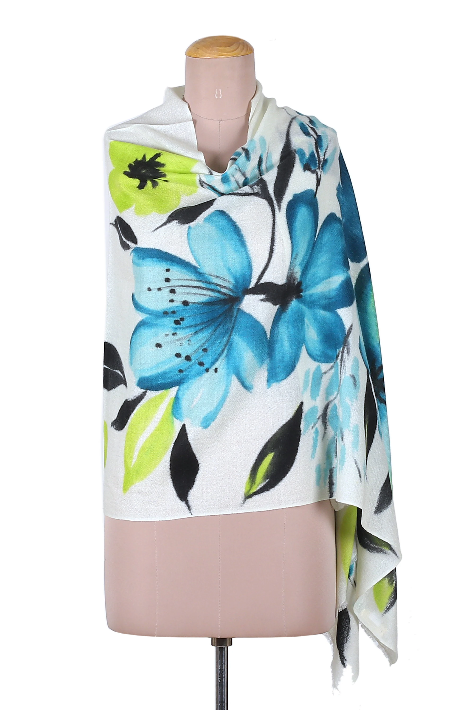 Blue petals take the beauty of spring to an enchanted twilight, creating this shawl. Wool and silk form this soft accessory, hand-painted by Shuja Ahmed to represent the ethereal side of the region's nights. Petals and leaves spread around the piece, allowing it to create a charming illusion.