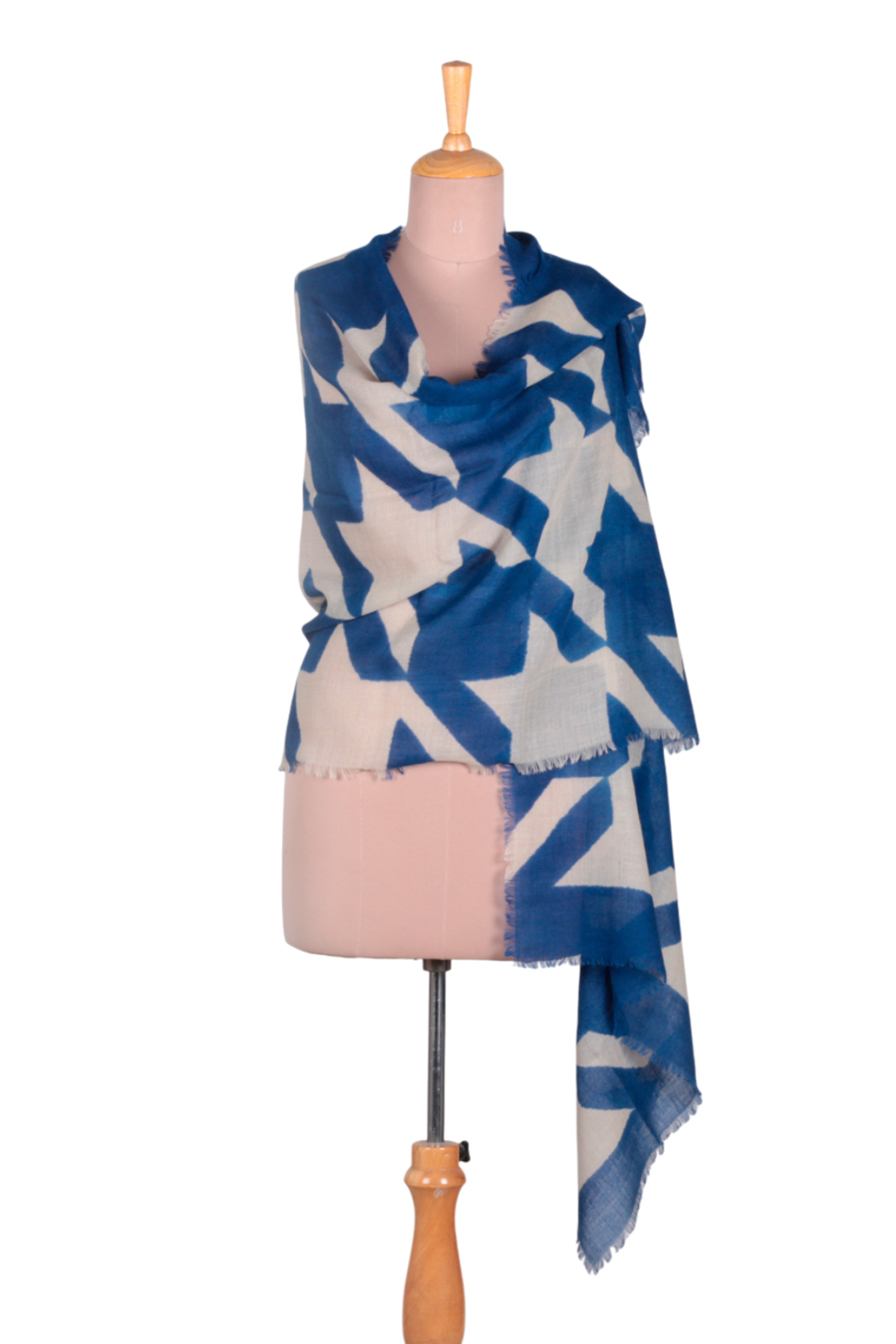 Blue and Ivory Wool Shawl with Printed Abstract Patterns, 'Contemporary Blue'