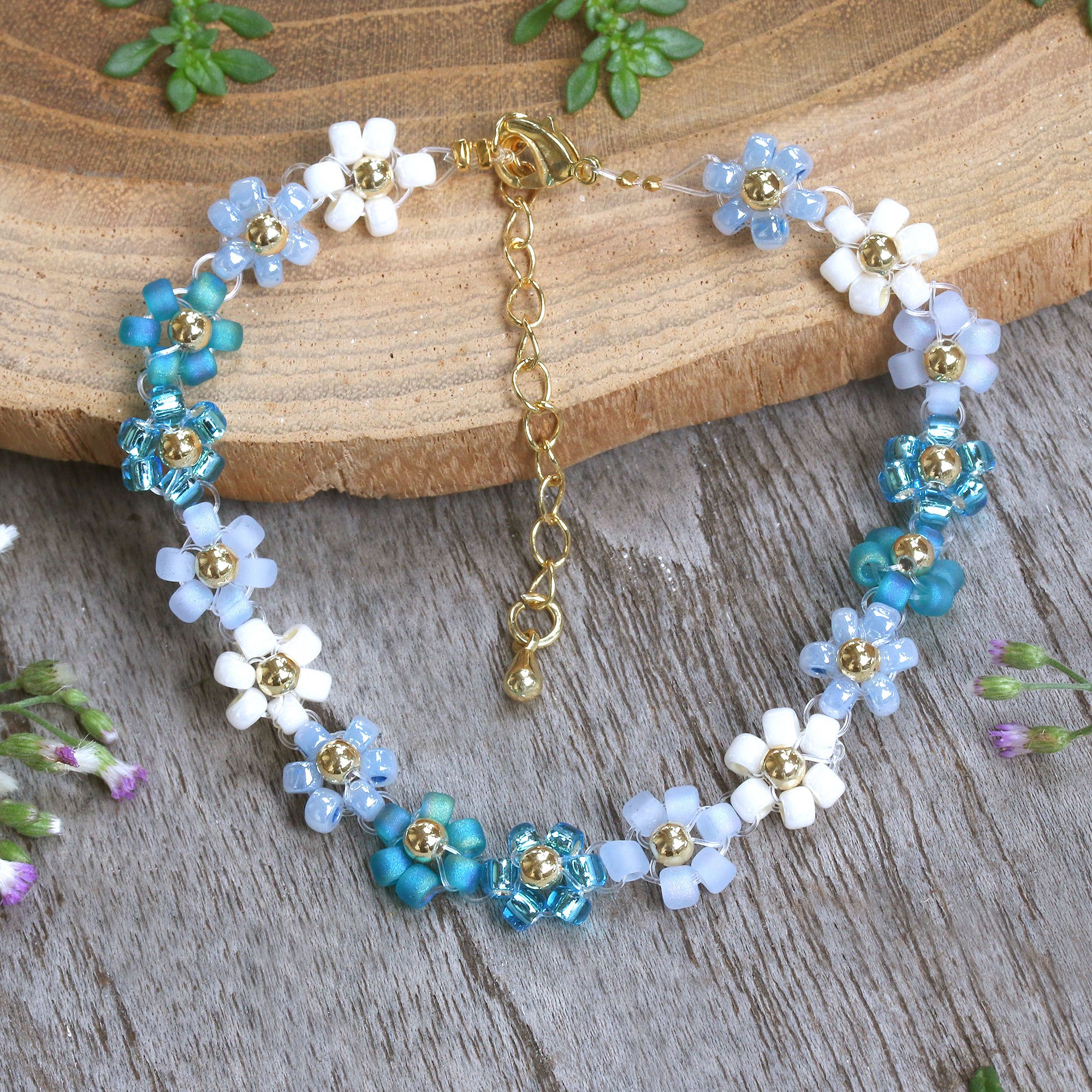Blue and Turquoise Crystal Beaded Bracelet with Gold Accents, 'Moonlight Petals'