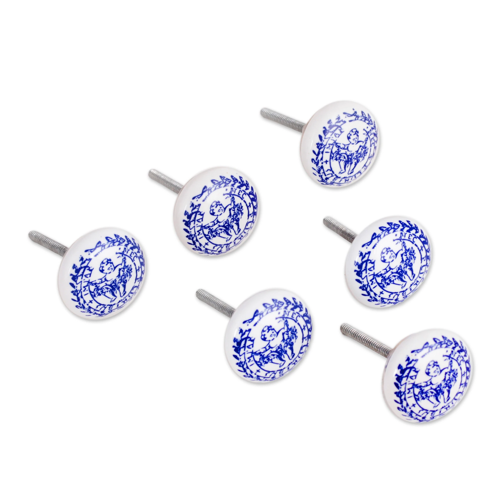 Little cherubs accompany your days with their heavenly tenderness, painted over this ceramic knob set by India's Chirag Choudhary. Crafted with traditional techniques, this set of six inspires a sense of traditional elegance thanks to its palette of white and blue hues, enhanced by strong iron fixtures.
