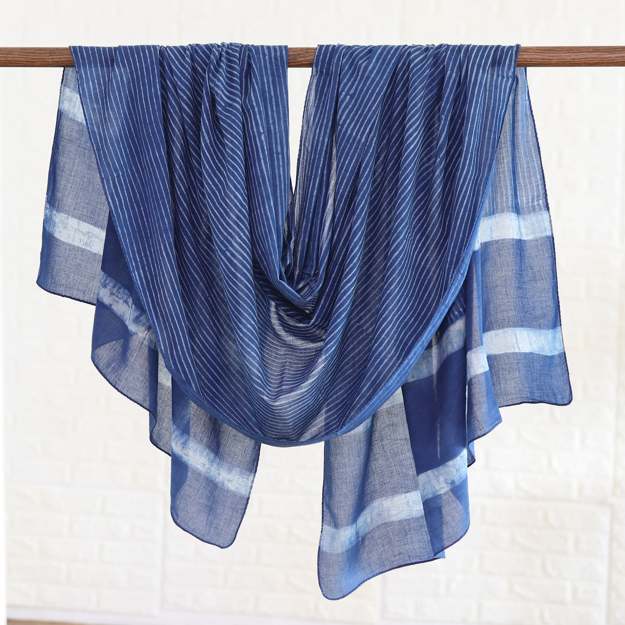 Blue and White Mud Resist Striped Block Print Cotton Shawl, 'Dabu Blue'