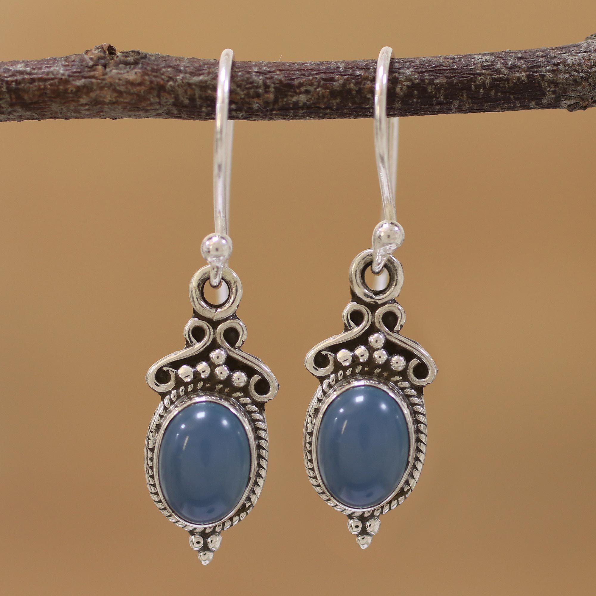 Exalting the beauty of chalcedony, Indian artisans design a pair of dangle earrings that accentuate the nurturing nature of the stone. Two blue oval gemstones are featured in the earrings, crafted of sterling silver with intricate rope, swirl, and dot designs that create a striking accessory with a combination of finishes.