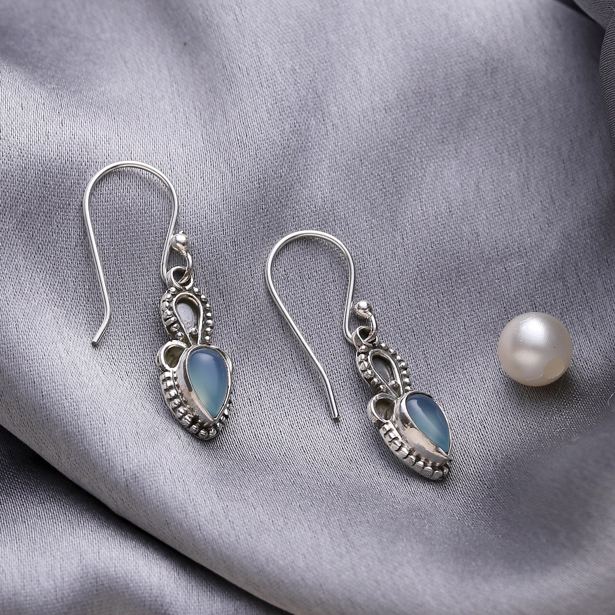 Considered by some to absorb negative energy, cool blue chalcedony is intriguing in these earrings from Alok Jain. Artisans set the cabochon gems in sterling silver bezels and surround them with silver rawa or granules. Contrasting oxidization adds interest to the unique earring design. The earrings swing from sterling silver hooks.